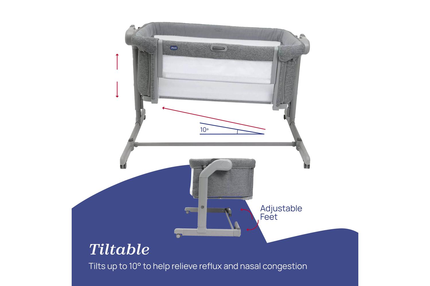 The Chicco Next2Me Magic Evo Crib also features two mesh windows, ensuring increased air circulation, coupled with a moisture-wicking mattress surface designed to provide your baby a cosy, dry sleeping environment day in, day out. The crib’s tilt function also aids in reducing reflux and congestion for a healthier, more restful baby sleep.