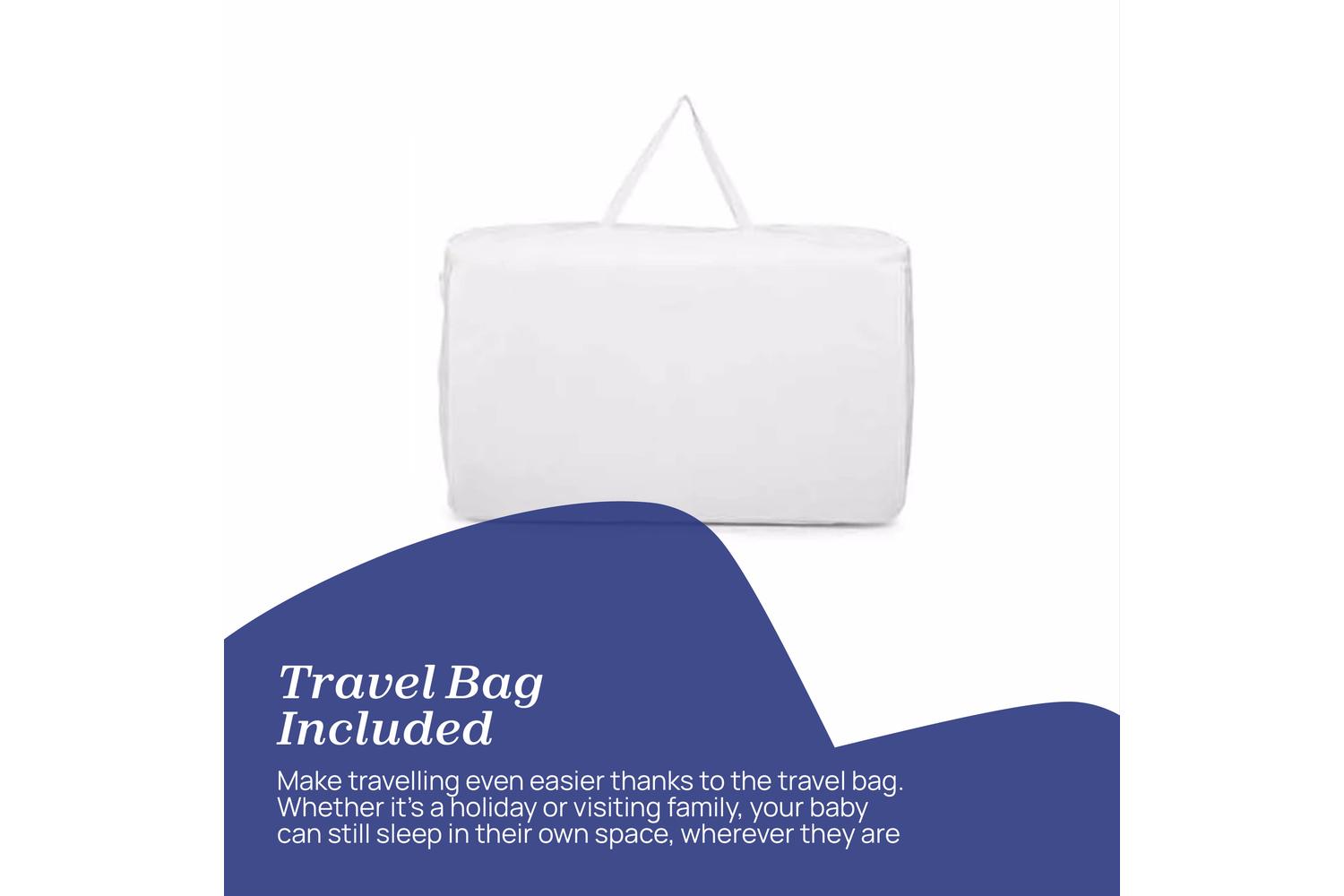 For your comfort, the crib offers adjustable height positions to fit most bed heights, and with its four lockable wheels, moving the crib around your home is literally a breeze. Furthermore, the crib’s foldable feet enables it to adapt to all types of beds, including divan bases, showcasing its impressive versatility.