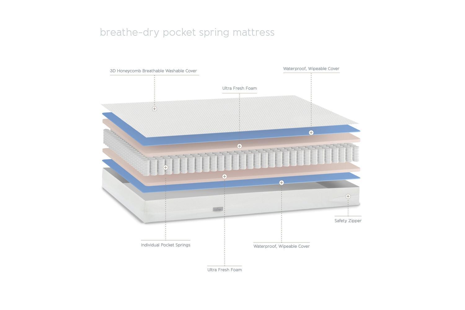 Choosing the right cot mattress is essential for your baby's development and wellbeing. The Breath Dry Pocket Spring Cot Mattress features a breathable core that promotes optimal airflow, helping to regulate your baby's temperature and reduce the risk of overheating. The innovative pocket spring system provides firm, even support, encouraging proper spinal alignment and healthy growth from the very first night home.