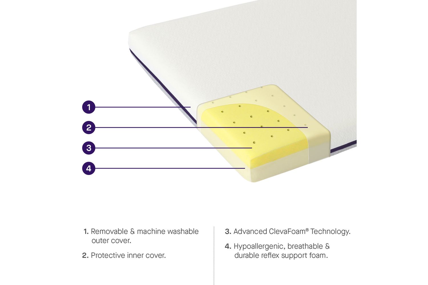 ClevaFoam® Support Mattress – Ultimate Comfort & SafetyThe ClevaFoam® Support Mattress ensures ultimate comfort and support, helping your baby sleep peacefully in any season. Scientifically developed with Trinity College Dublin, ClevaFoam® reduces pressure on your baby’s head by 50% and increases support by 80%, aiding in flat head syndrome prevention while supporting growing joints. Designed for safety, it is lightweight, breathable, and reduces heat retention. The removable cover and hygienic waterproof lining allow easy cleaning. Made from hypoallergenic, pH-balanced, and toxin-free materials, it suits babies with asthma and allergies. The airflow fabric enhances ventilation, wicks moisture, and is Oeko-Tex 100 certified for safety. Features Luxurious cot bed mattress - Perfect supportive babies and toddlers cot bed mattress 120x60 for the correct alignment of the spine and a superior comfort for head, neck, and body. Made with ClevaFoam® technology - Our scientifically proven reflex foam prevents flat head syndrome (plagiocephaly) and relieves pressure on young developing joints. Restful sleep anytime - The unique formulated composition with 11 cm of comfy thickness supports fast-growing baby and helps sleep safely anytime and in any season. Hypo-allergenic and Toxin free - Mattress with an open cell and Airflow multilayers structure, 100% breathable, manufactured using water as an alternative blowing agent. Machine washable and easy to clean - Cover with wetness and dust mites protection special fabric with a zipper around the mattress to remove that easily.