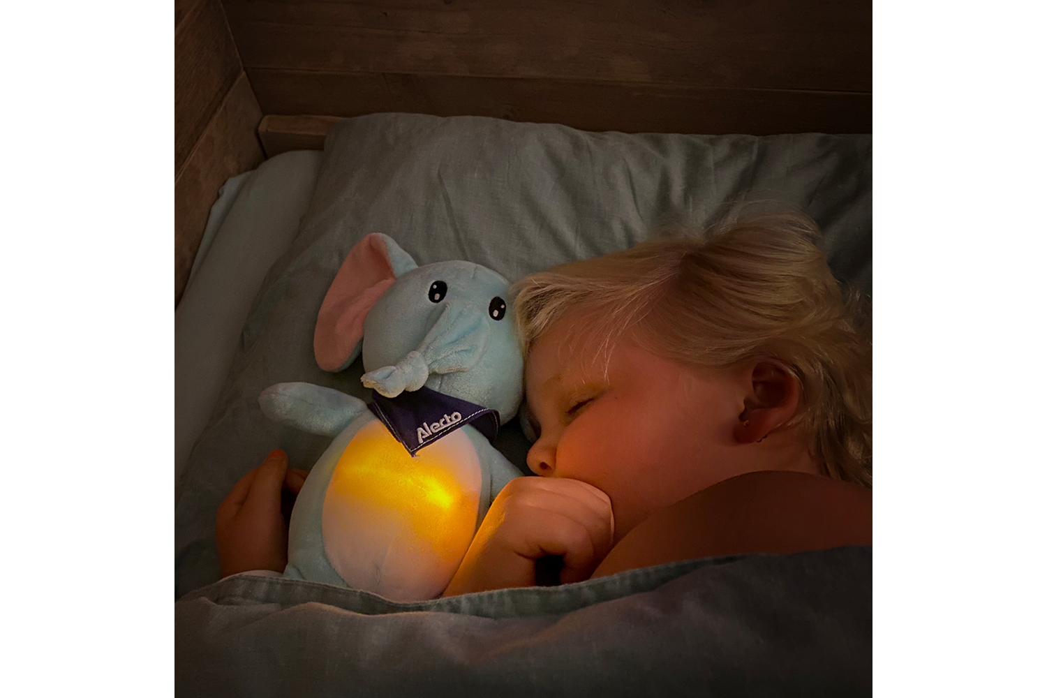 The soft toy comes in the shape of a cute elephant that your child can grab, cuddle and hold close. Inside its tummy, there is a night light that turns on by pressing on the leg. To save energy, the light turns off automatically after 30 minutes. The night lamp’s colour intensity is adjustable (3 levels + off) by pressing the leg repeatedly.