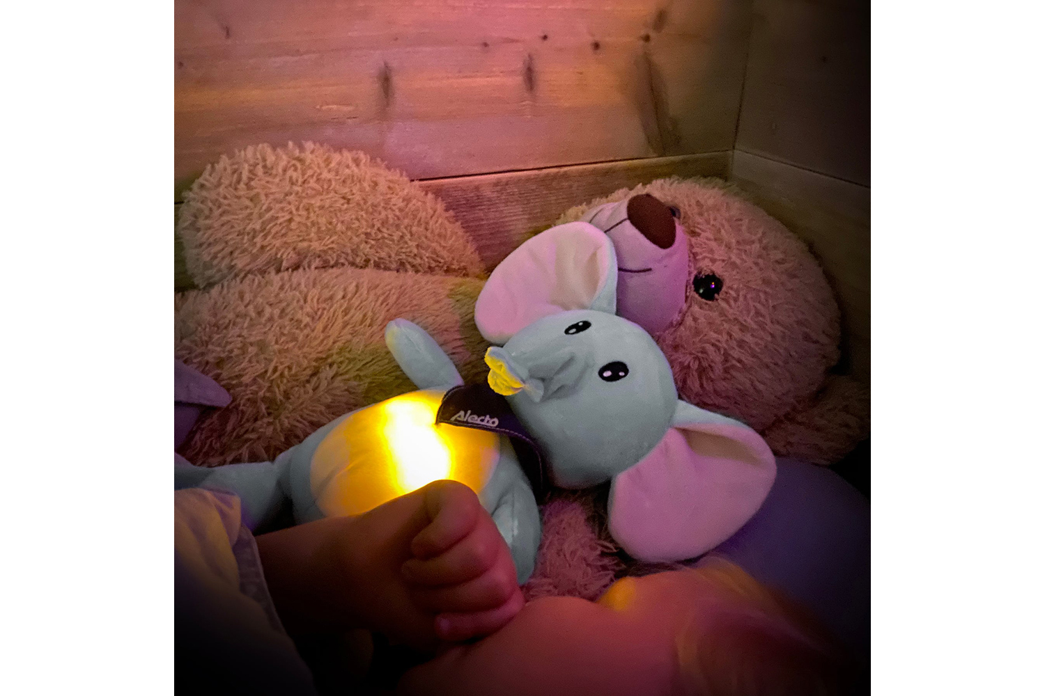 The Alecto BC350 is a 3-in-1 plush soft toy that helps your child fall asleep calmly and comfortably. A lovely, soft toy with a night light, soothing sounds, and lullabies.