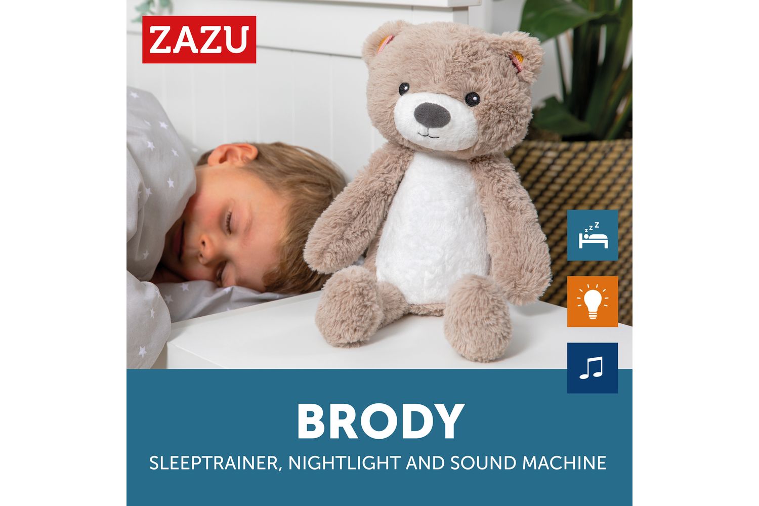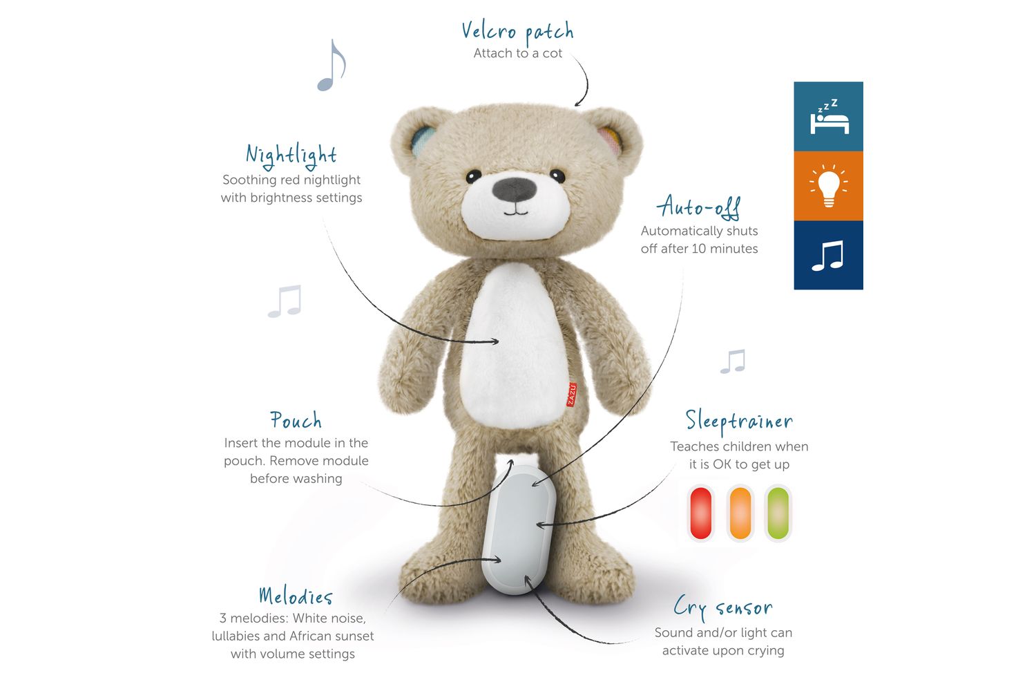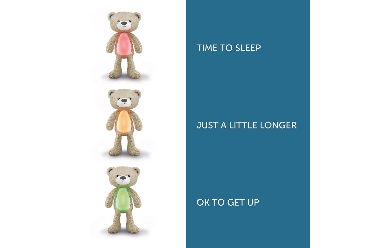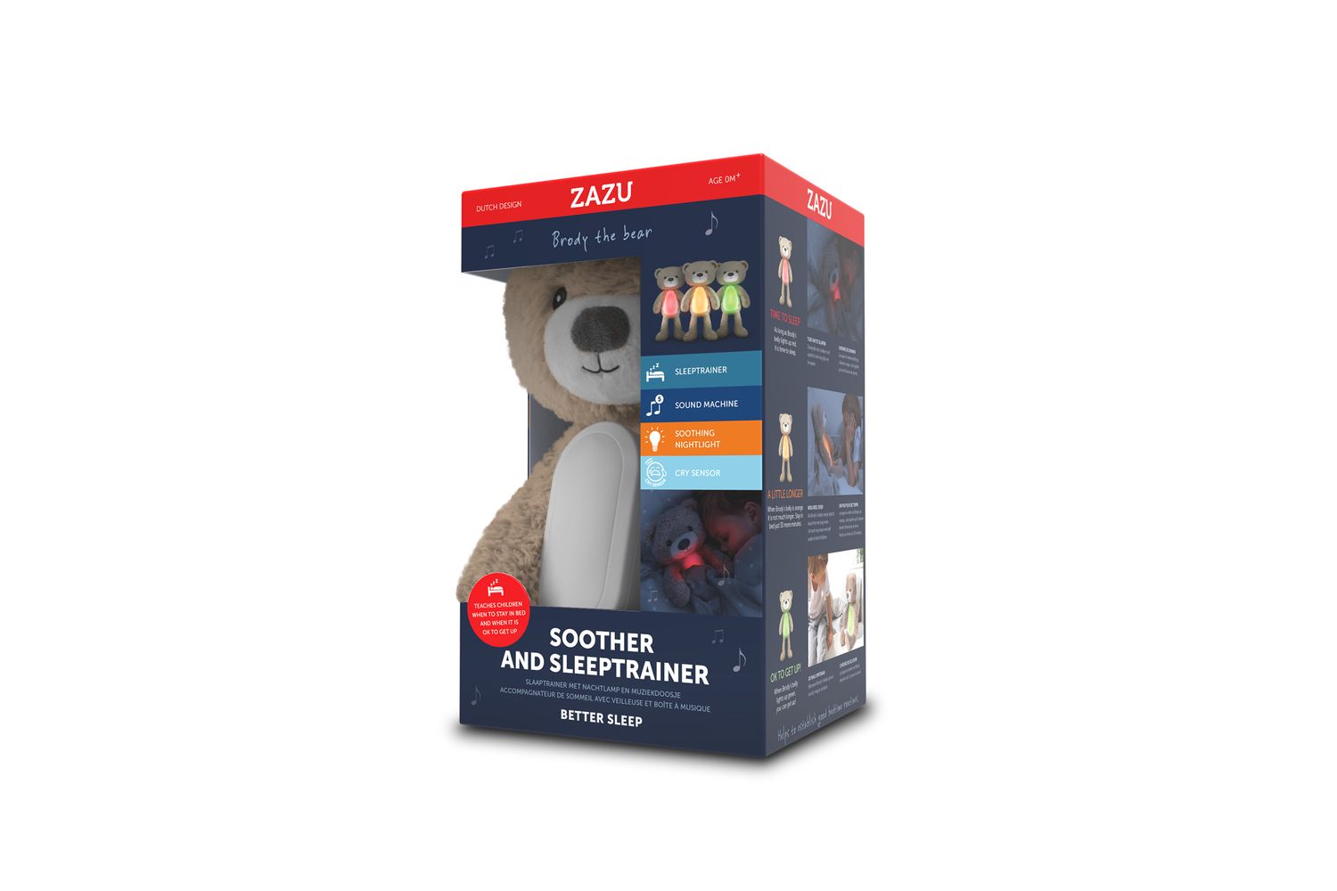 Sleeptrainer Brody can help your little one to fall asleep in the evening with his soothing nightlight and comforting songs. In the early morning he can show your child when it is time to sleep and when it is OK to get up.. Brody’s light changes colour like a traffic light, to denote night, early morning and OK to get up.Features