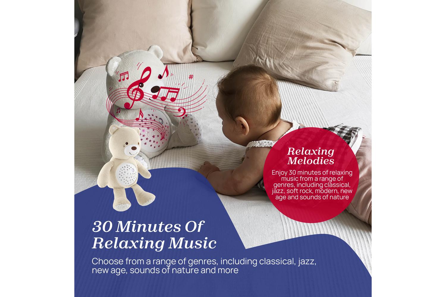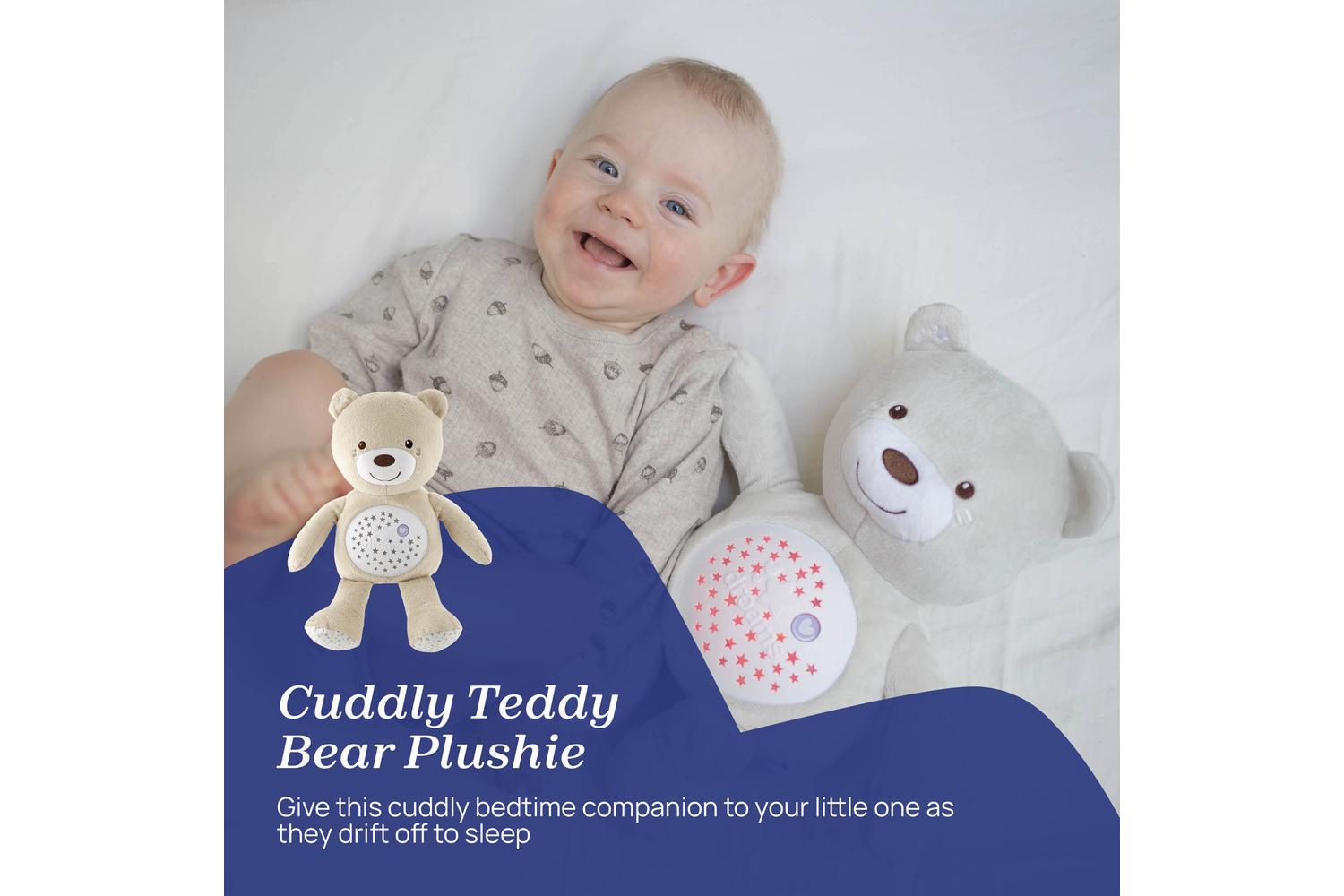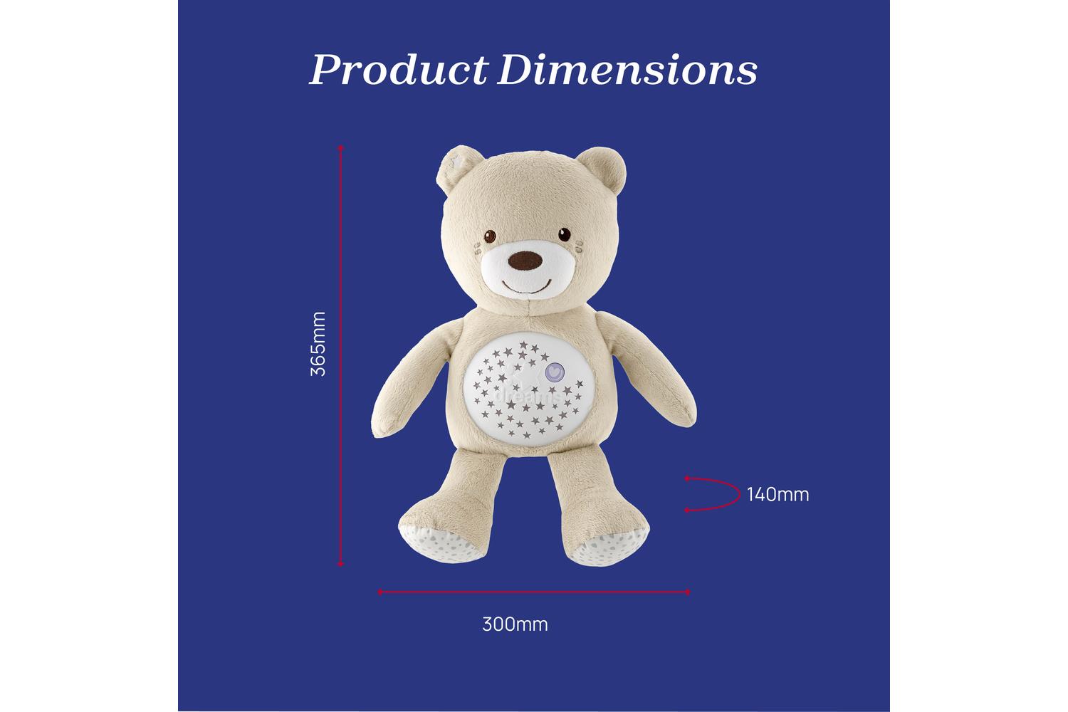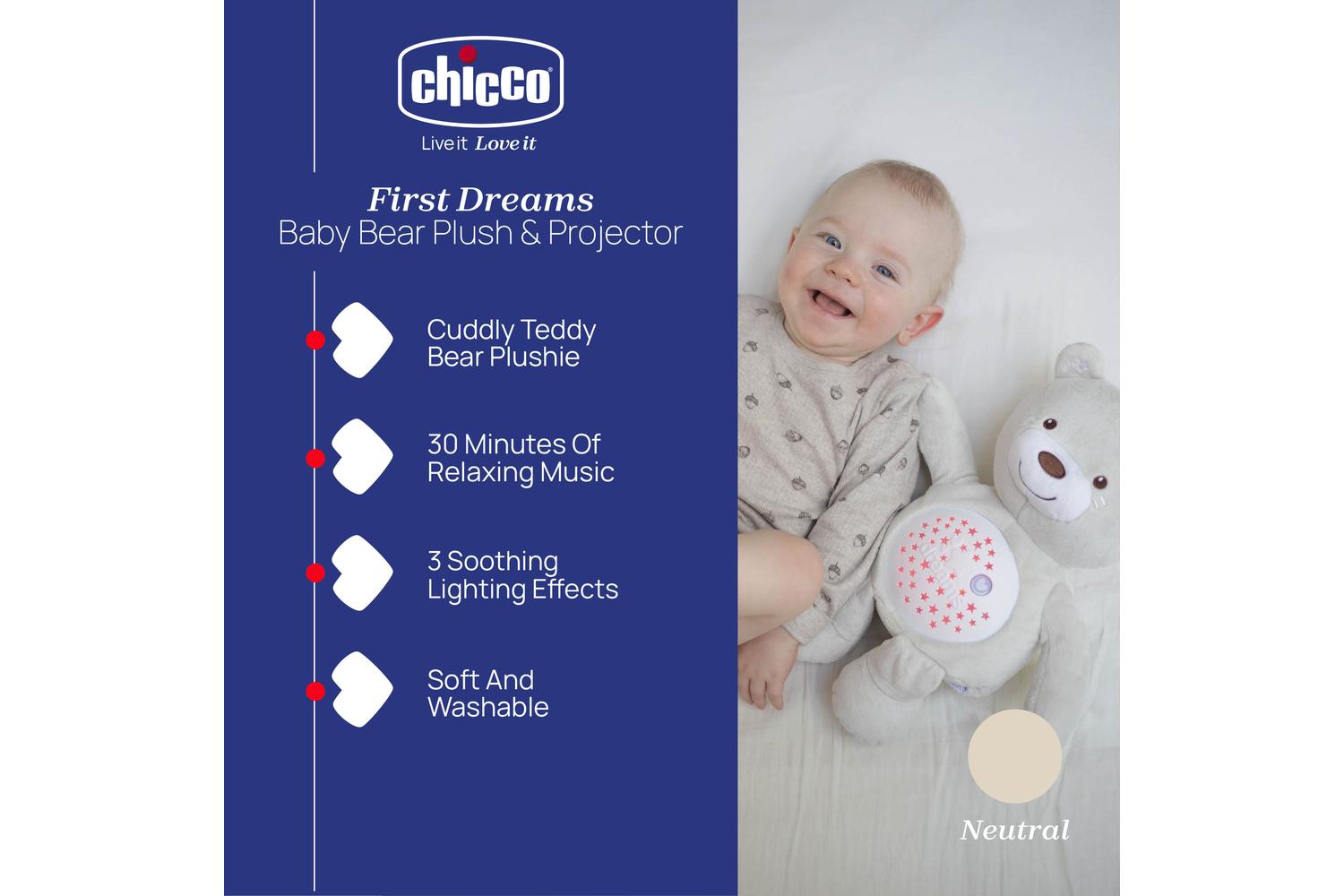 Encasing love and comfort, the Chicco First Dreams Baby Bear Plush And Projector is an essential addition to your baby's nursery. Designed by the renowned brand, CHICCO, this plush baby nightlight and music projector is epitomised to make bedtime a peaceful routine. Innovative, soothing, and cuddly, this blend of a soft plush toy and a light projector is the ideal partner in championing your little one's sleep.