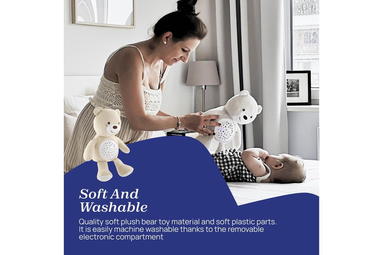When it comes to creating a magical atmosphere in your baby's sanctuary, the Baby Bear Plush Projector does it with effortless charm. It casts a warm, unwavering glow, with an automatic colour change feature, decked up with three levels of light intensity to suit the ambient requirement. The dreamy ambiance provided by this baby sleep aid is poised to make your cherub drift with comforting melodies, creating a tranquilizing backdrop for a sound sleep. The provision of six genres of music to choose from can personalise the infrastructure of pleasure for your baby.