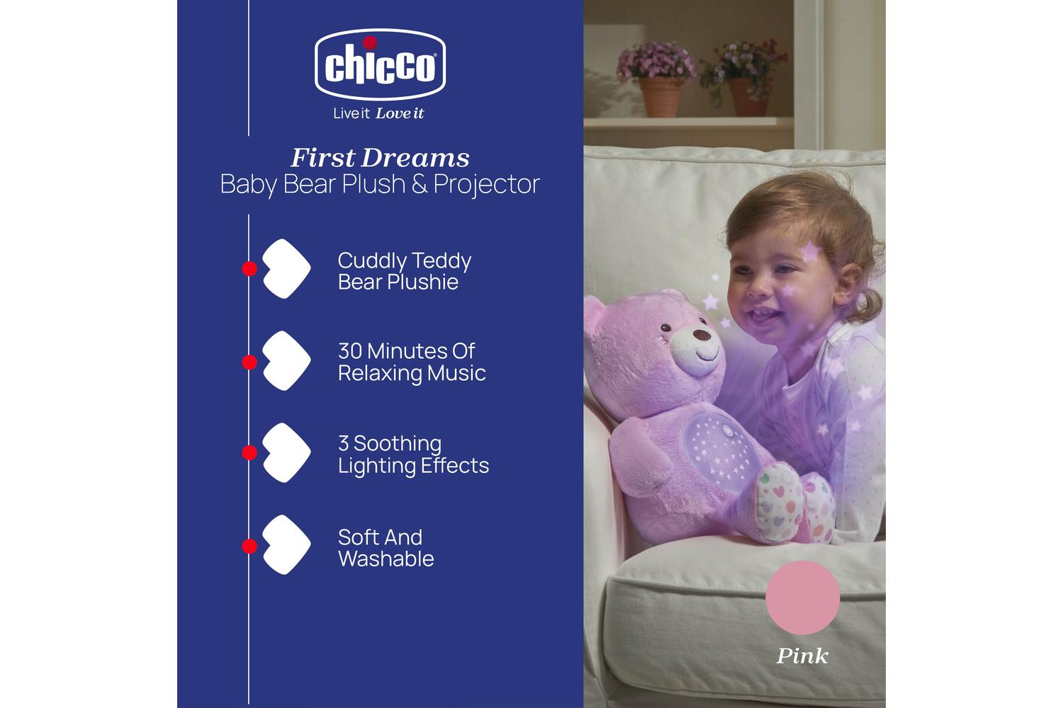 Add the CHICCO First Dreams Baby Bear Plush and Projector to your baby's nursery and witness the tranquillity this comforting companion brings at bedtime. Graced with an enchanting light show and relaxing melodies, this plush projector ensures your baby's dreamtime is peaceful and soothing.
