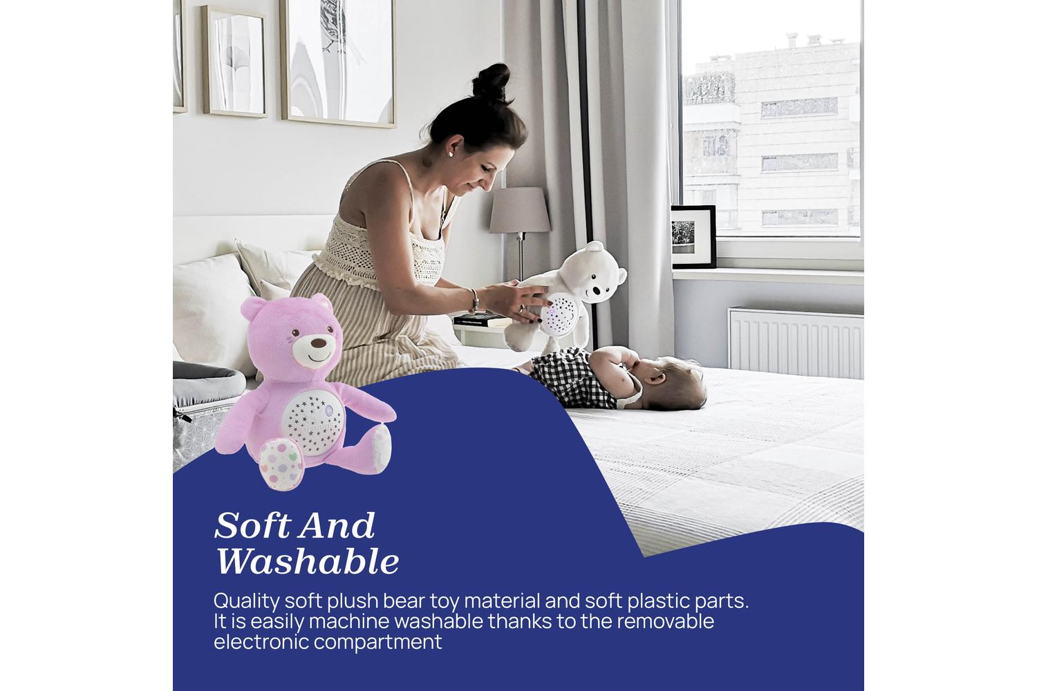 The plush comes adorned with a helpful lilac button, enabling quick melody selection from the palette of six rich musical genres. It's not merely about comfort but also hygiene - the bear projector is machine washable, with a removable battery unit making washing a breeze, ensuring maximum freshness for your child's favourite playtime amigo.
