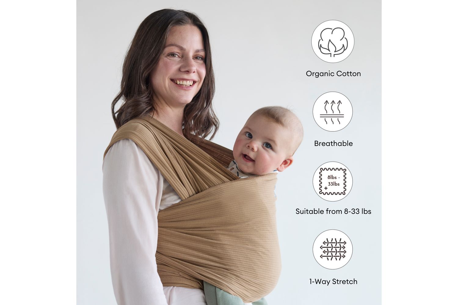 This Gaia Baby Stretchy Wrap is made from 100% certified organic cotton. Super soft and breathable, it can be used from newborn (min. 3.6kg) up to 3yrs / 15kg. Delivering lasting comfort for you and your baby, our wraps are made from superior quality cotton (180gsm) with 1 way stretch for ease of use. Our step-by-step video instructions give you the confidence to carry your baby from the moment you bring them home. Endorsed by the Hip Dysplasia Institute and certified to CEN TR16512, our wraps offer 3 ergonomic carry positions for optimum lower back and hip development. We want you to enjoy wearing your Gaia Baby wrap so we have made them size-inclusive, in soft tones inspired by nature. Our packaging is made from certified sources and we use recycled materials where possible. Features 100% certified organic cotton Sustainable & biodegradable Even weight distribution while naturally supporting your baby in the optimal development position Naturally anti-bacterial, biodegradable and free from chemical dyes Suitable from 8-33 lbs or 3.6 - 15kg, with carry positions; Newborn, Baby & Toddler Soft and breathable with easy to use 1-way stretch fabric Gender-Neutral and size-inclusive design Machine washable Dimensions Length: 550 cm Height: 55 cm Weight: 0.46 kg
