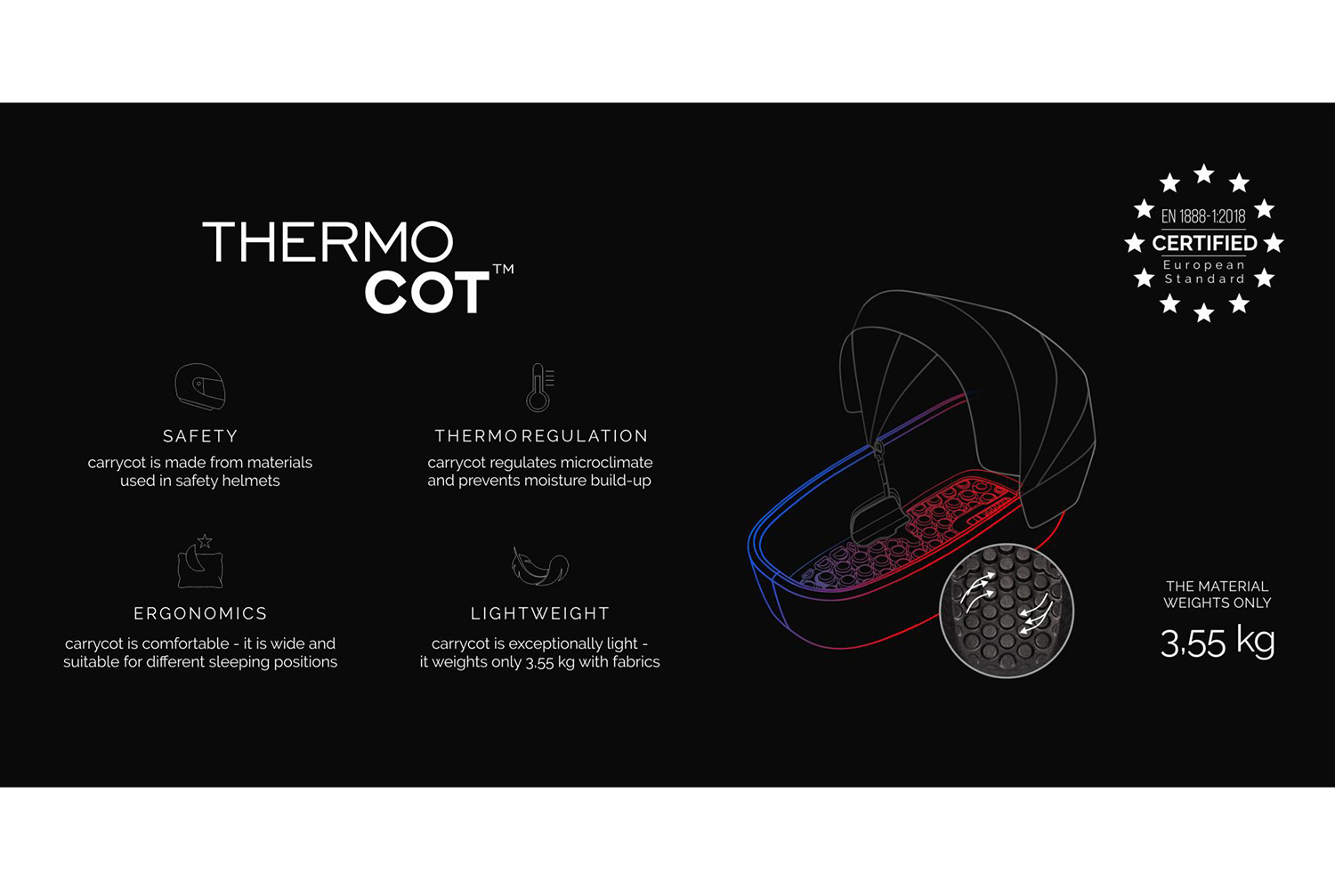 Luno All Trails provides all the possible safety & comfort that the family may need. Ultra-light & spacious thermal carrycot ThermoCot takes care of the baby in many ways: it regulates microclimate, protects the baby from inadequate temperature changes, and reduces humidity. Firm & high carrycot walls ensure maximum safety. An adjustable rear shock absorption system and 2nd generation Real-Gel wheels ensure perfect handling in all terrains.