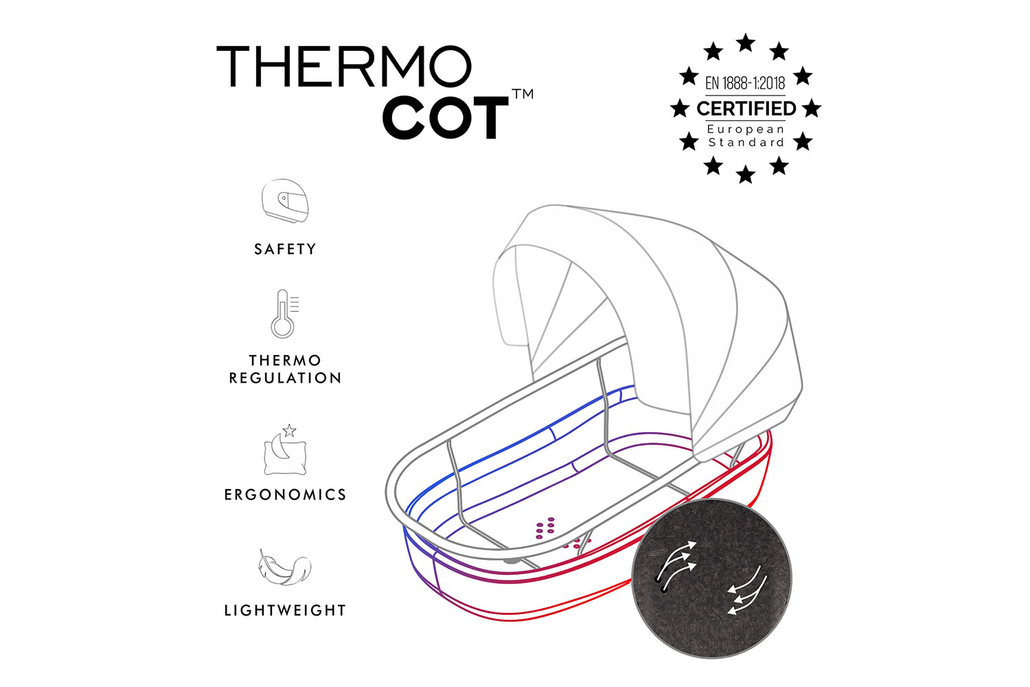 Ultralight ThermoCot thermal carrycot. Wide and safe carrycot that regulates microclimate, includes a built-in ventilation system and reclining back rest which plays a big role in your babys health and safety.