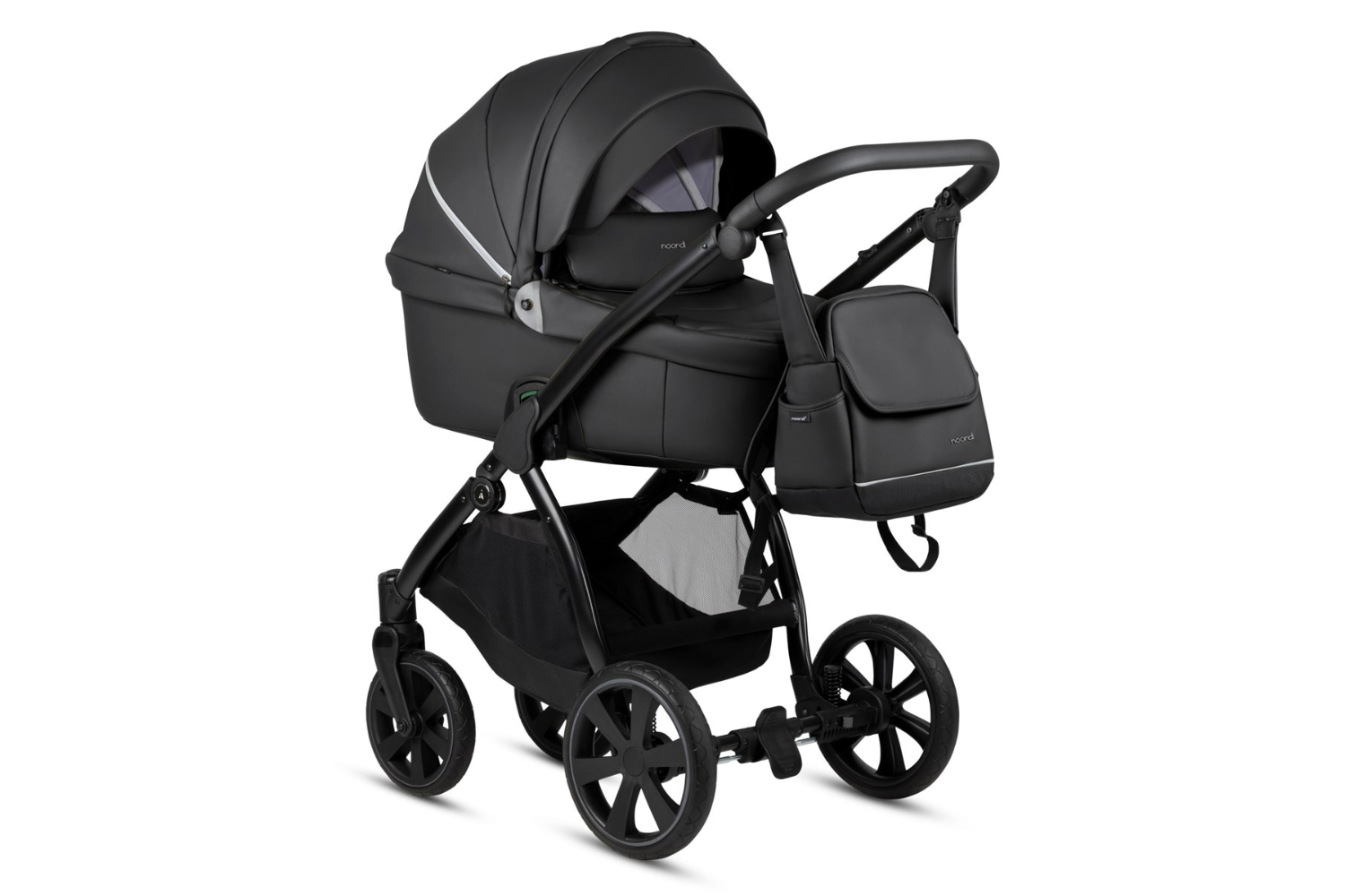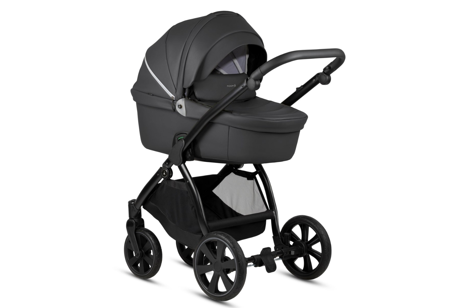 Exclusive Eco-leather model: The eco-leather Noordi Fjordi combines luxury with practicality. Its exclusive eco-leather design, thermal insulated carrycot, and water-repellent fabrics offer both style and comfort. Enhanced with a chic, matching eco-leather backpack, this pram is the epitome of sophistication for active, style-conscious families.
