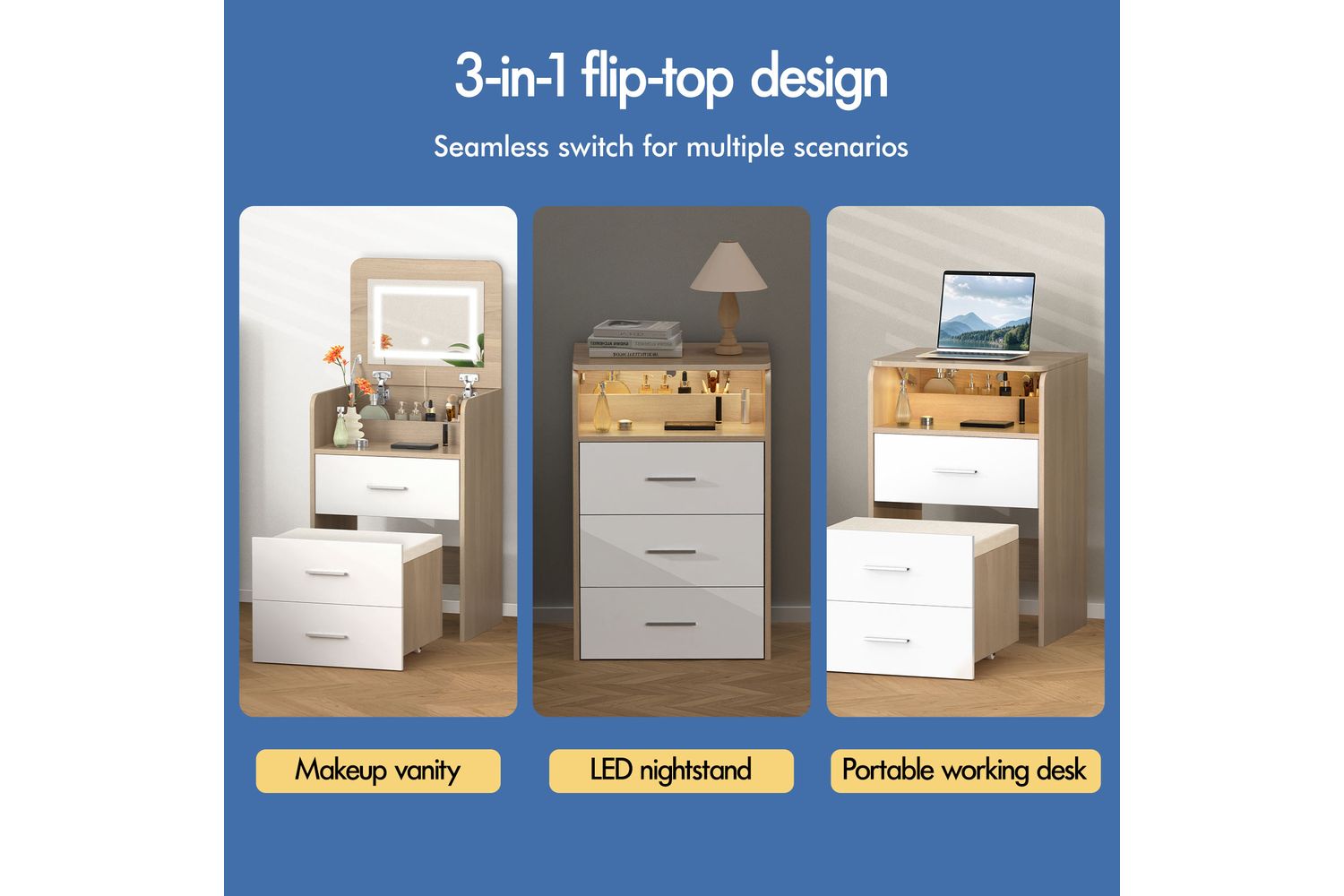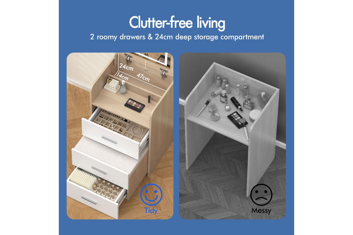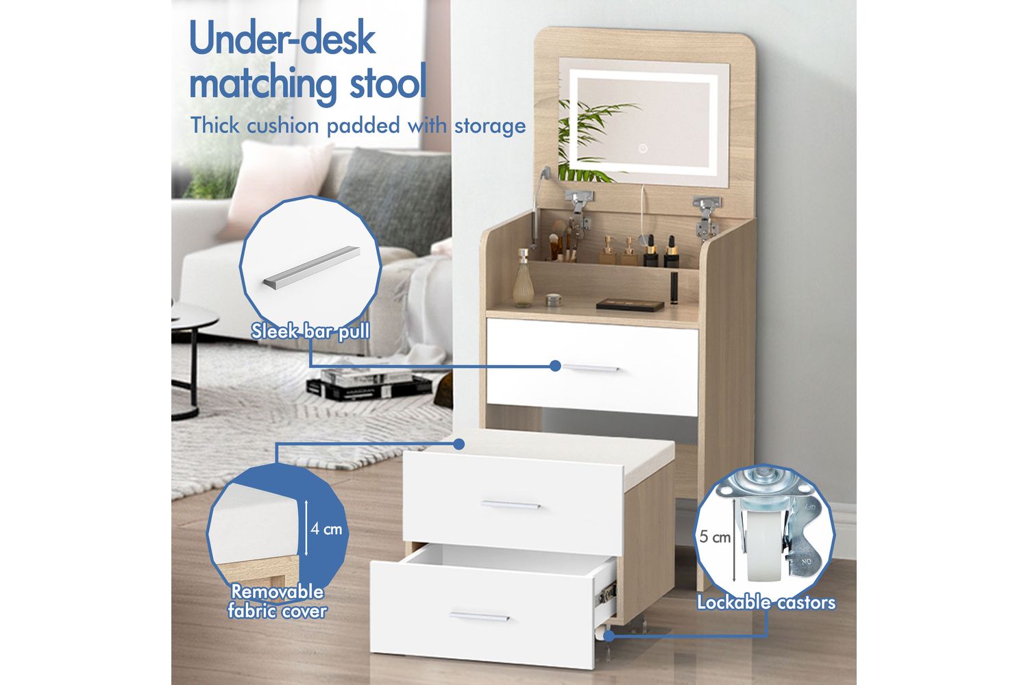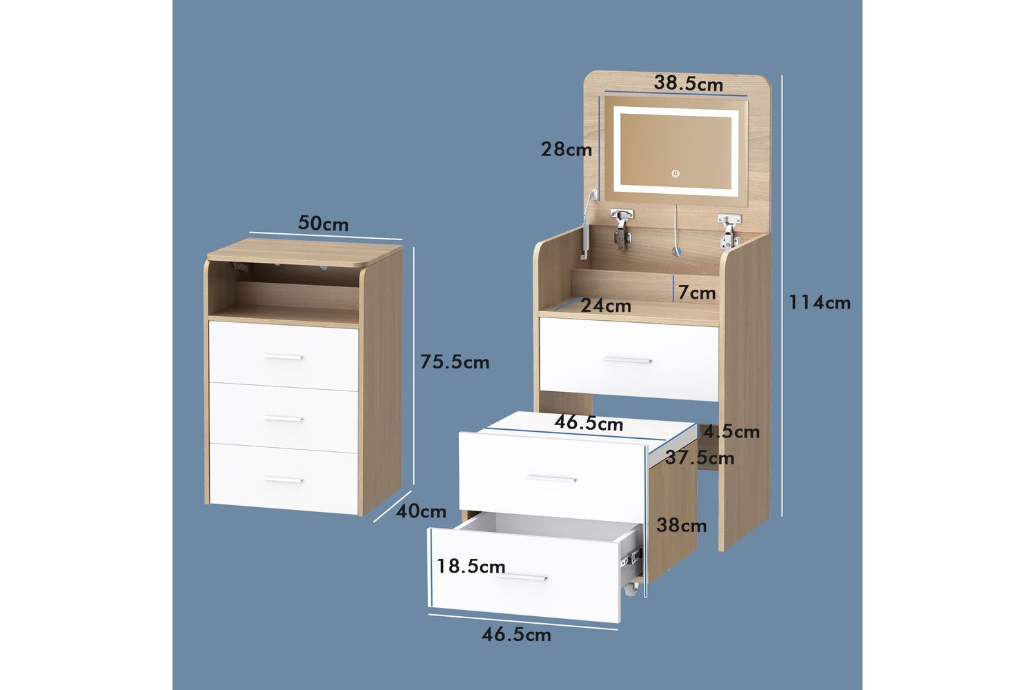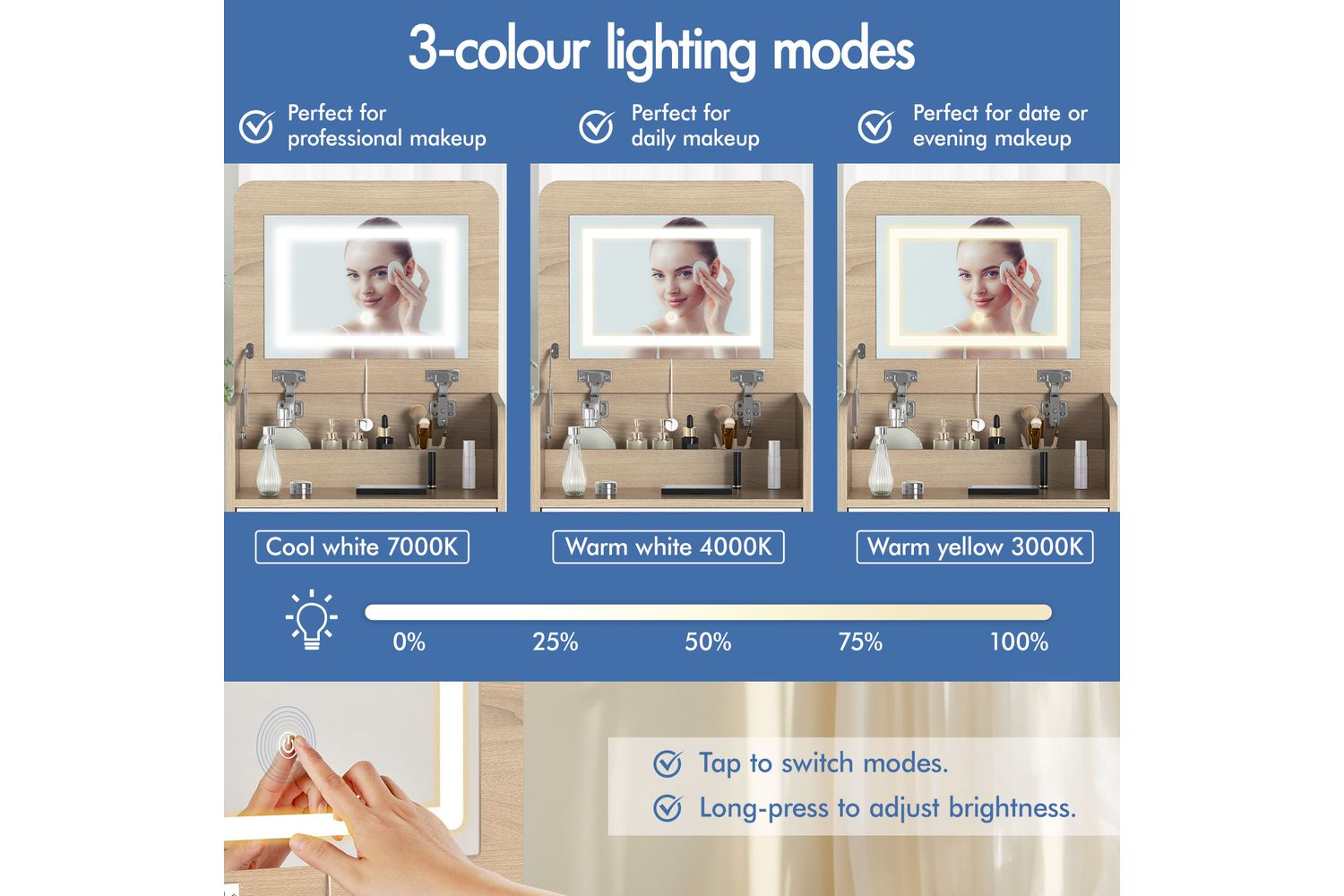 Featuring a spacious tabletop, two smooth-gliding drawers, and a clever flip-up top, this vanity desk offers ample room for all your beauty essentials. Whether you are storing make-up, skincare products, or perfumes, everything is within easy reach. The integrated illuminated mirror with three adjustable light colours—cool white, warm white, and warm yellow—ensures flawless application in any lighting, making it ideal for both early mornings and evening routines.