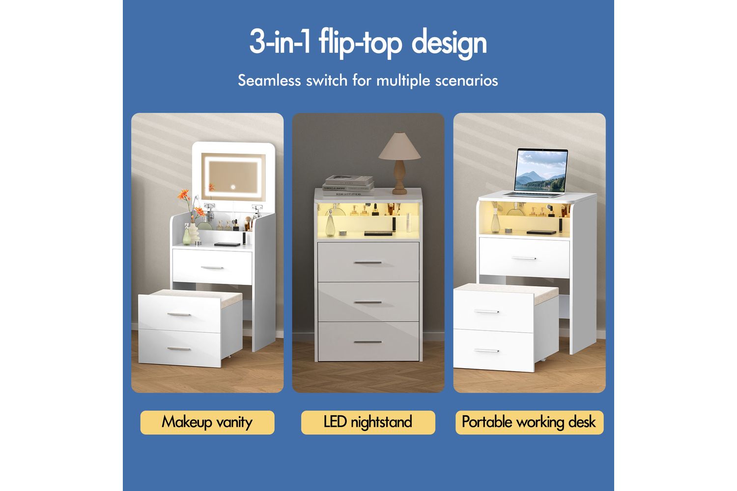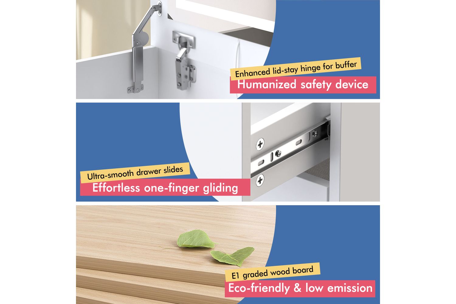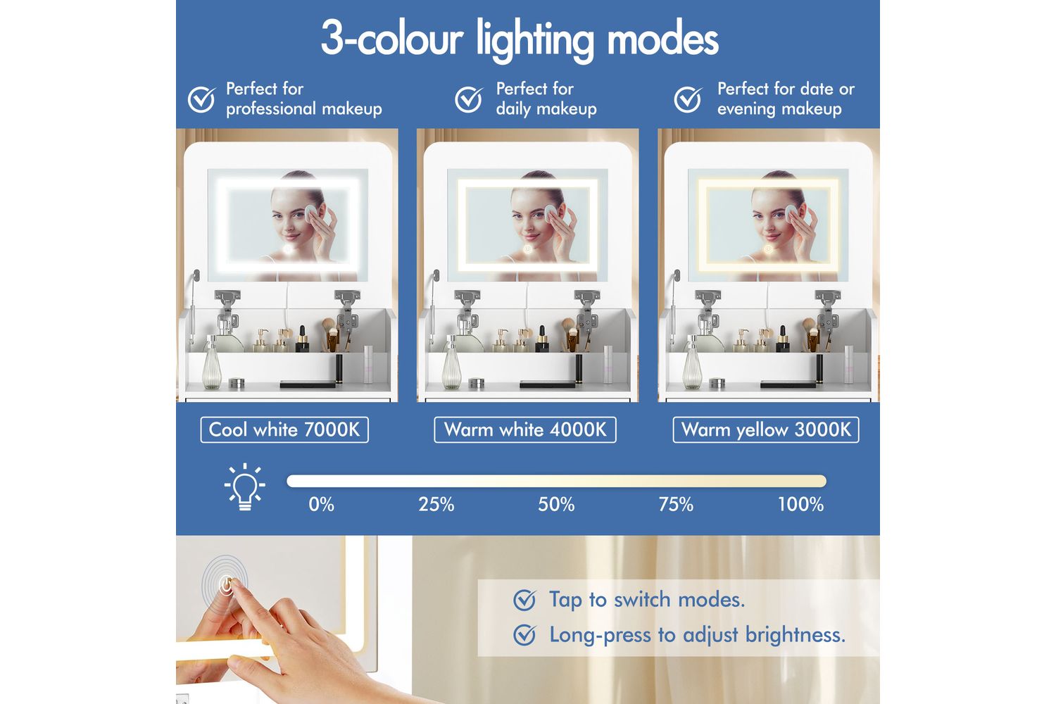 The Alfordson Vanity Desk stands out with its illuminated mirror, offering three adjustable light colours—cool white, warm white, and warm yellow—so you can achieve flawless makeup application in any lighting condition. The innovative flip-up tabletop reveals a spacious storage compartment, while two smooth-gliding drawers and open shelves provide ample room for your cosmetics, skincare, and accessories. Keep your favourite perfumes, lotions, and daily essentials within easy reach on the generous tabletop, making your morning routine effortless and enjoyable.