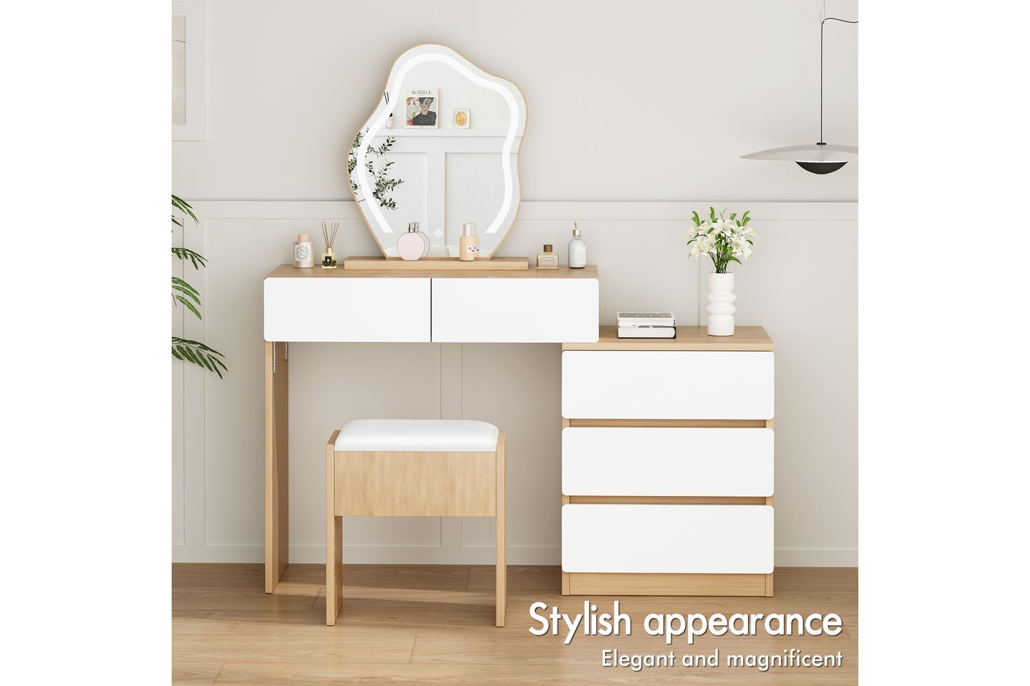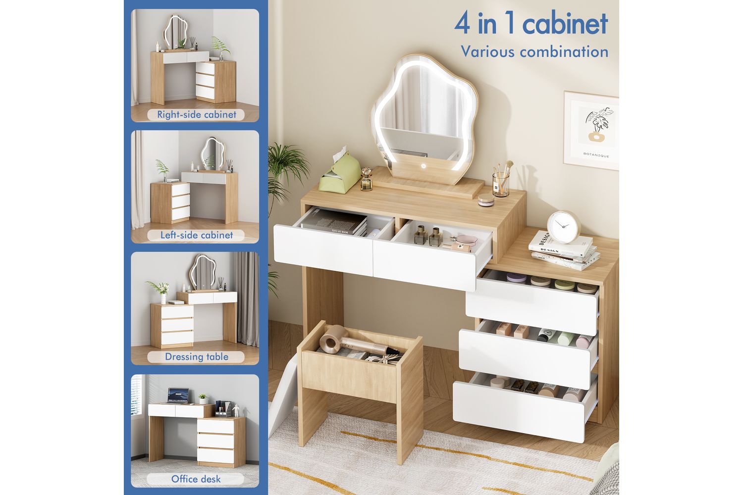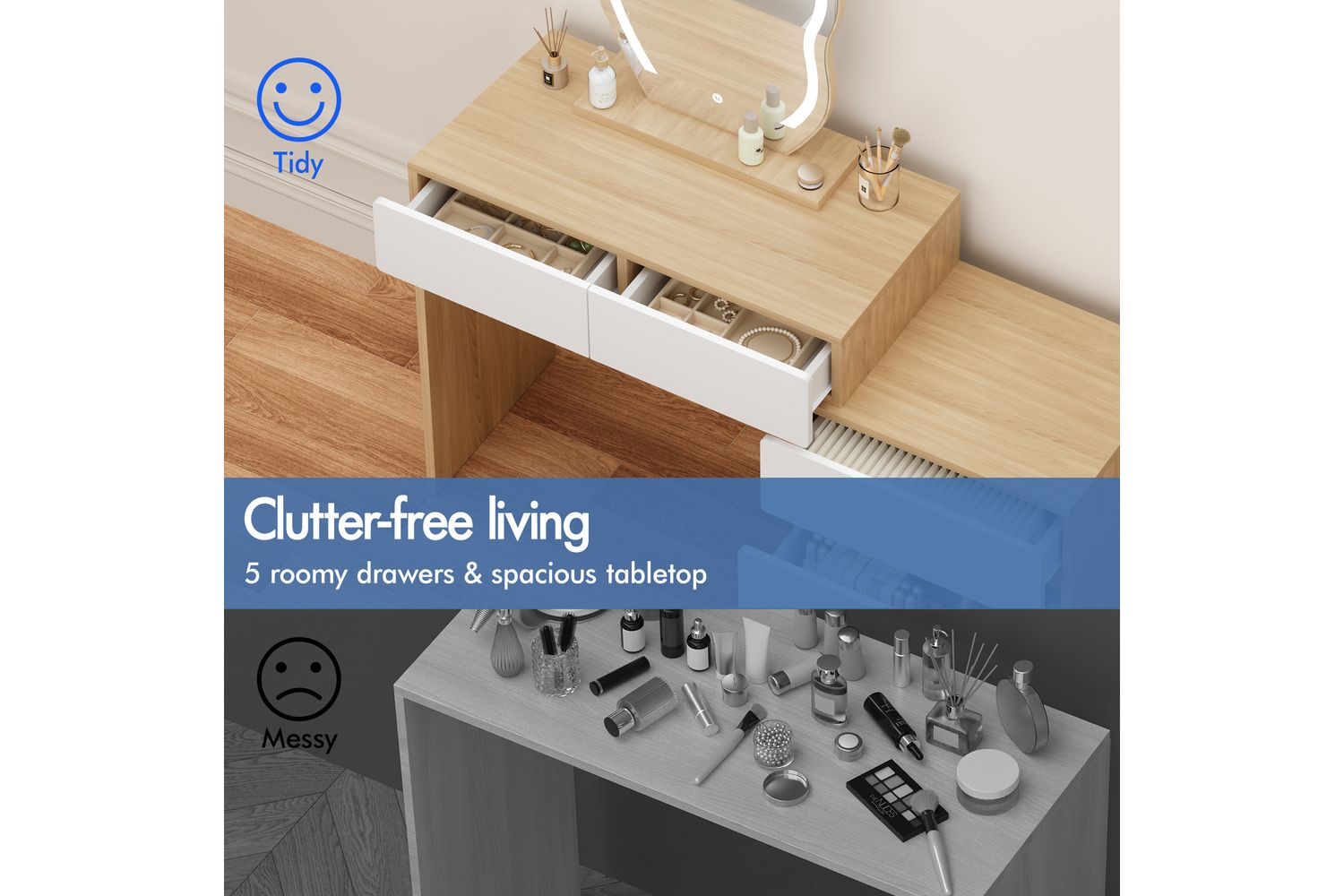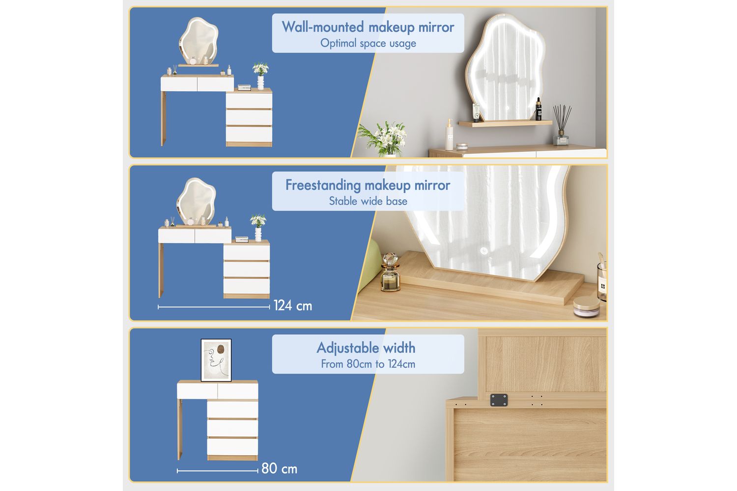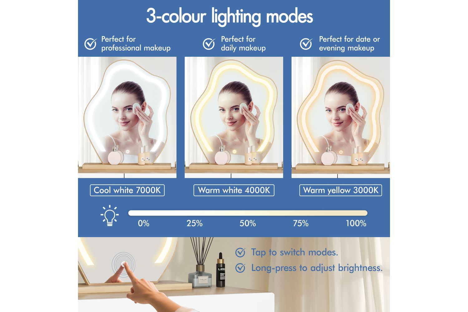Say goodbye to cluttered countertops and rushed mornings. The Alfordson Makeup Vanity Desk features a spacious tabletop and two generous drawers, providing ample storage for all your cosmetics, skincare, and accessories. The clever design includes a wall-mounted, free-standing mirror with 10-level dimming, allowing you to customise your lighting for flawless makeup application, whether you prefer neutral white, warm white, or daylight white. The adjustable width ensures the desk fits perfectly in any bedroom, large or small, while the interchangeable cabinet can be positioned on either side for maximum flexibility.
