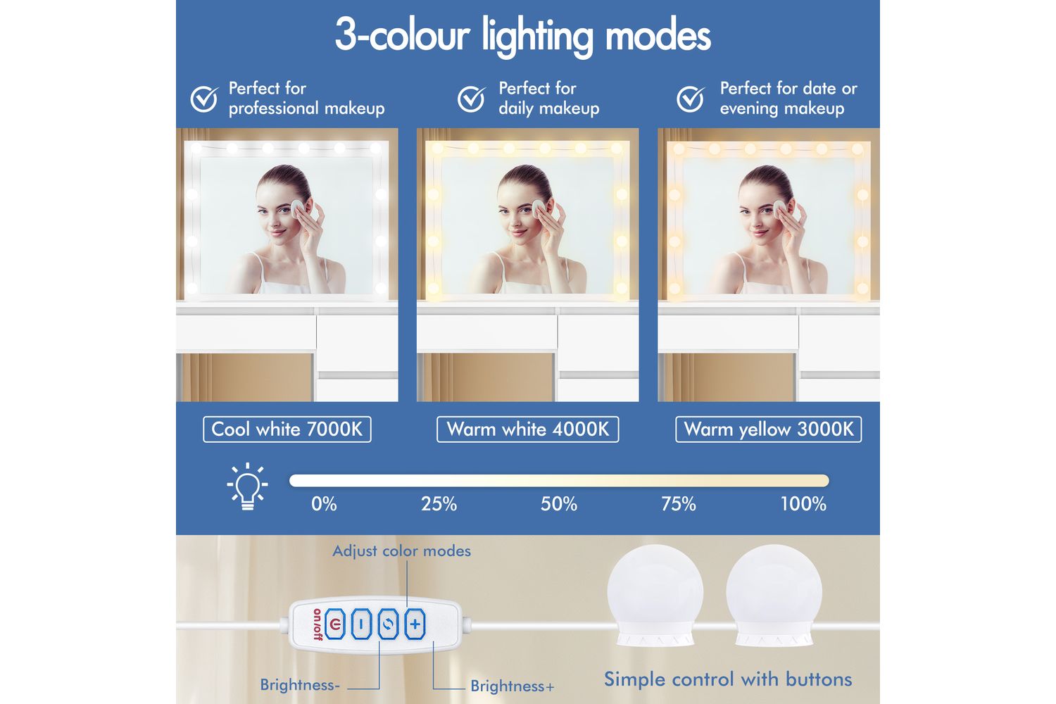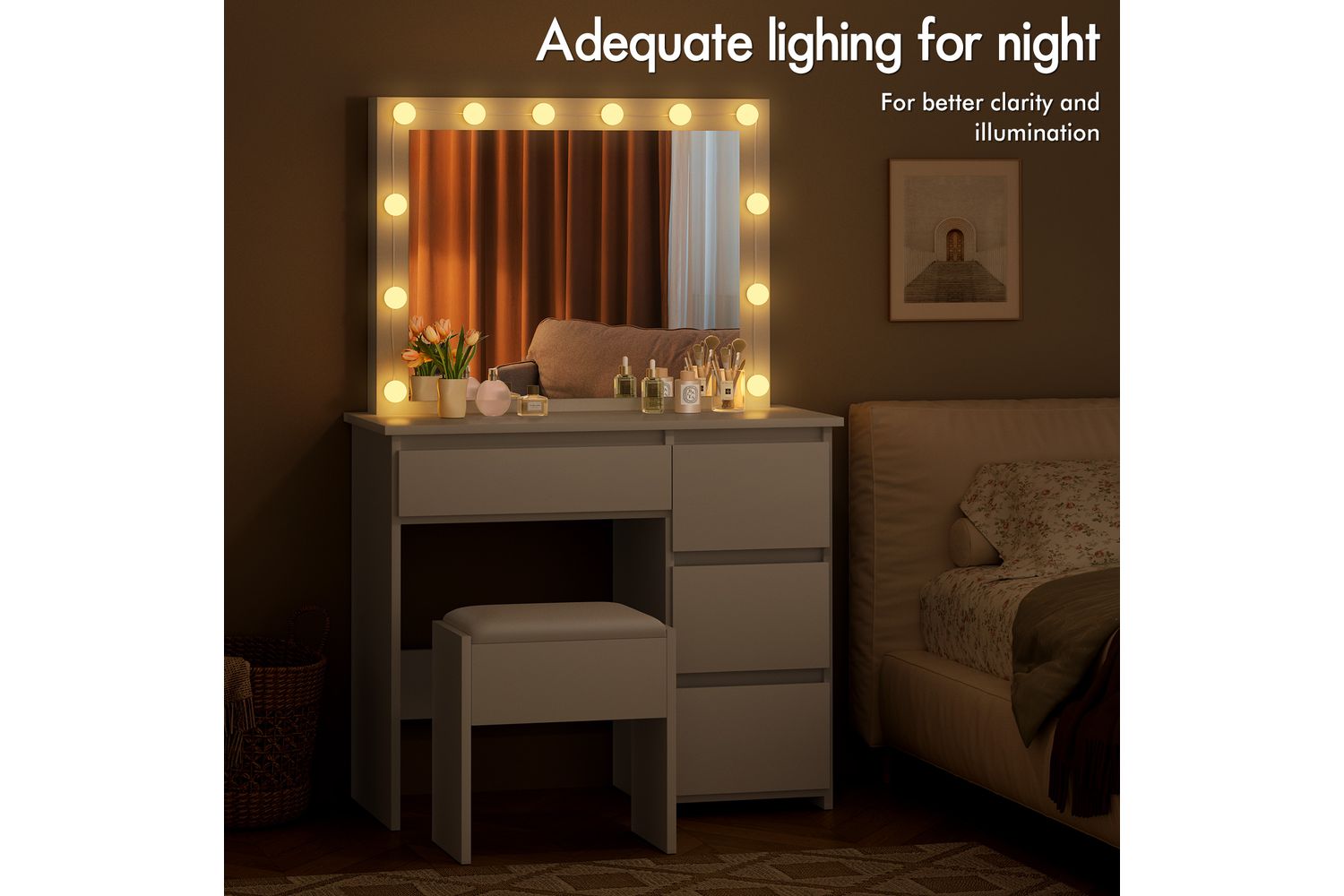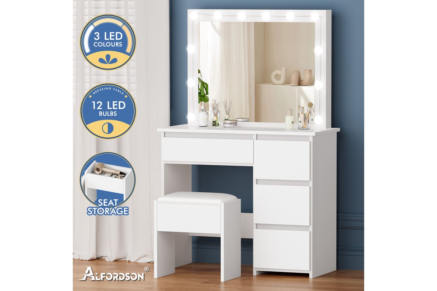 Featuring a spacious 90cm desktop, the Alfordson Vanity Desk Set offers ample room for your makeup, skincare, and accessories. The four discreet drawers provide generous storage, allowing you to keep your essentials neatly tucked away and your tabletop pristine. The integrated mirror, surrounded by 12 LED bulbs, delivers perfect lighting for flawless makeup application. With three adjustable light colours—neutral white, warm white, and daylight white—you can customise your lighting to suit any time of day or mood, ensuring you always look your best.