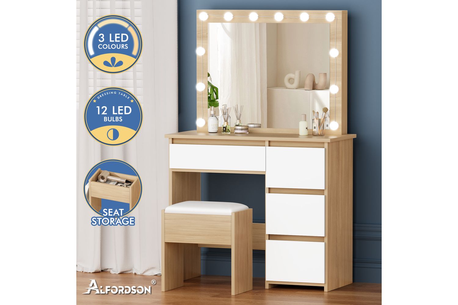 Bring home the Alfordson Vanity Desk Set and enjoy a beautifully organised, well-lit, and stylish space every day. Perfect for Irish homes seeking both function and flair in their beauty storage and organisation.
