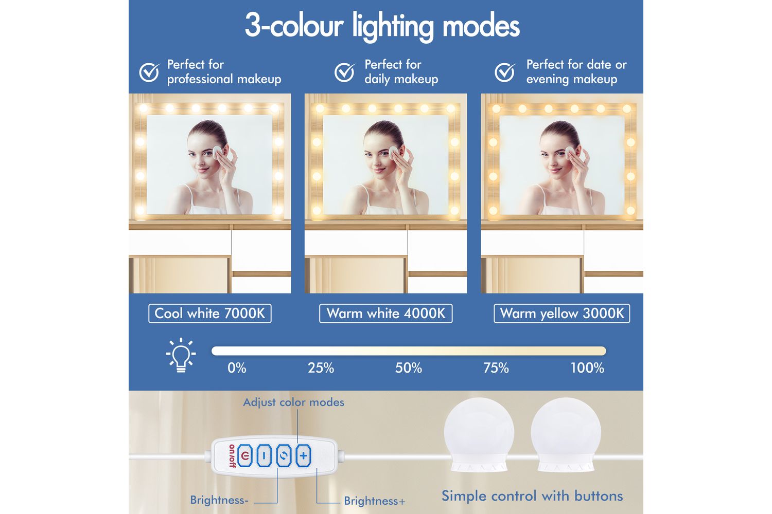 The integrated mirror is surrounded by twelve adjustable LED bulbs, offering three light colour options: neutral white, warm white, and daylight white. Whether you are applying makeup in the early morning or getting ready for an evening event, you can always find the perfect lighting to suit your needs. The LED bulbs are USB powered, energy-efficient, and built to last, ensuring your vanity is always ready when you are.