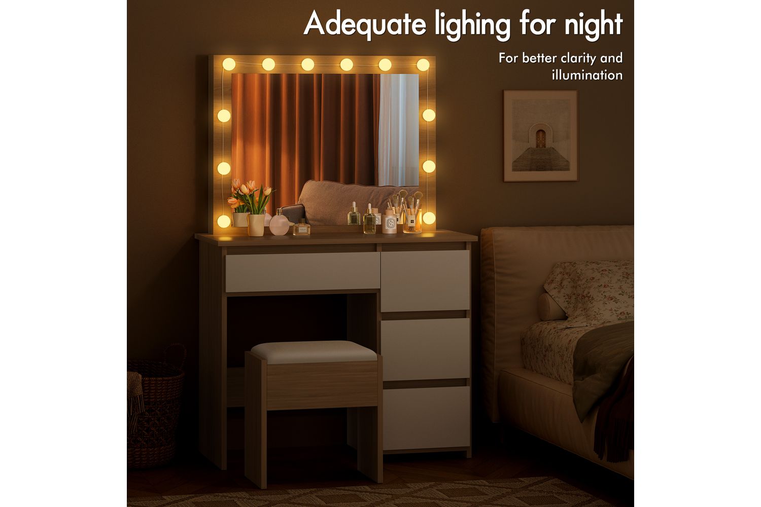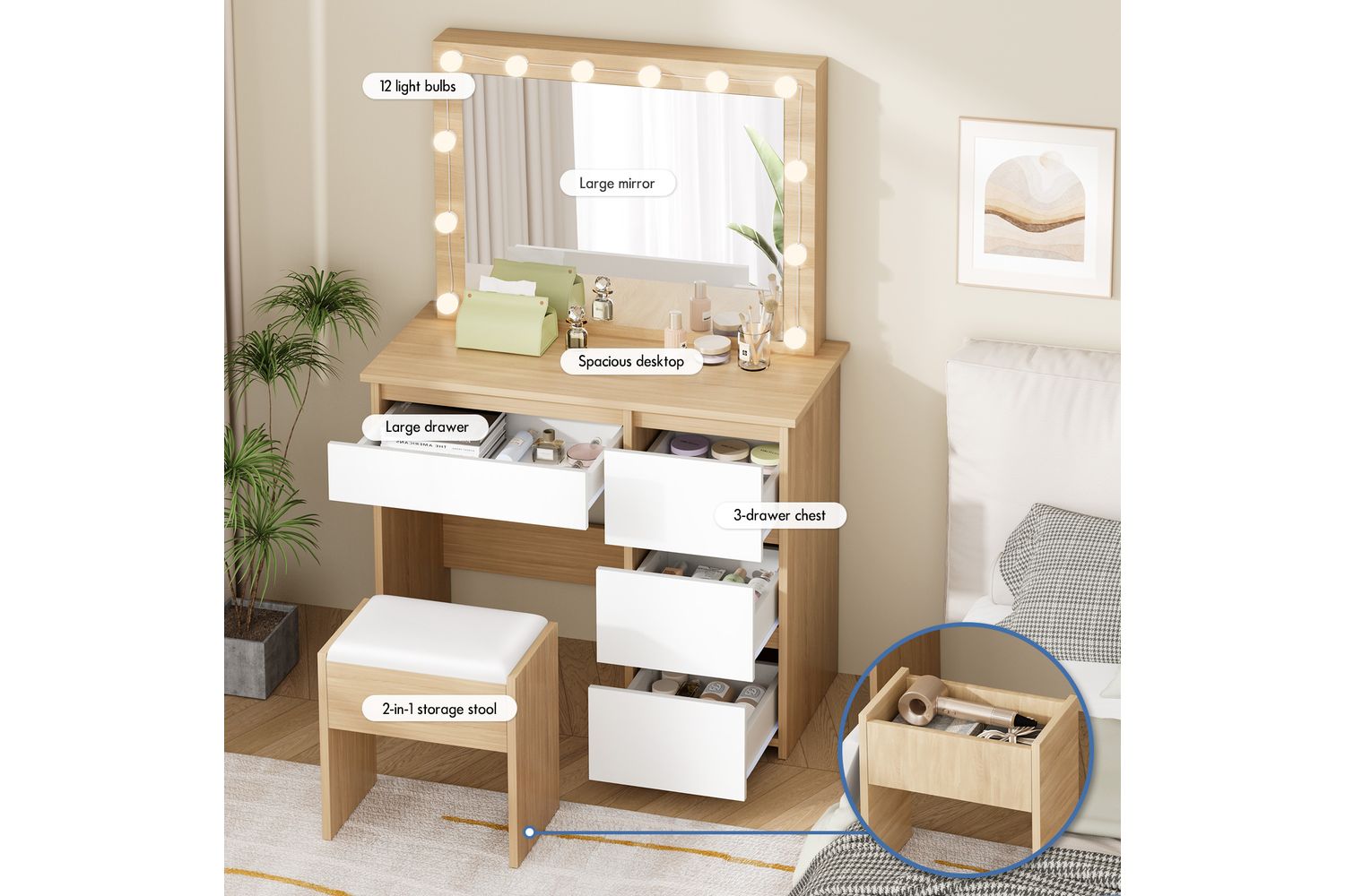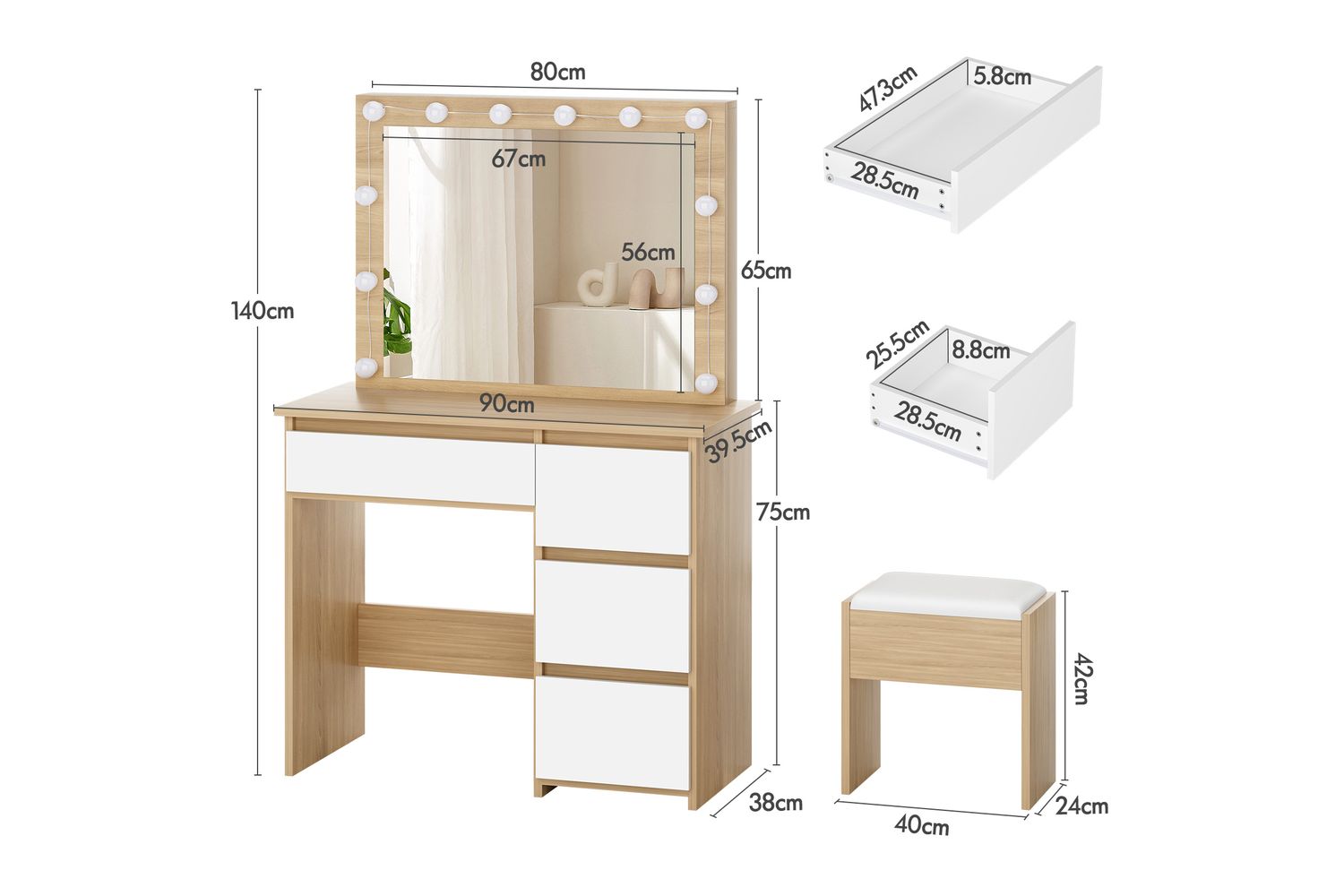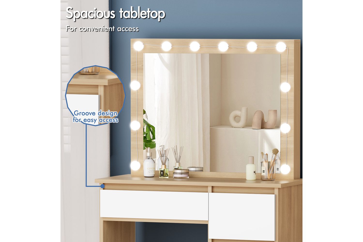 - Spacious 90cm wood-effect tabletop for all your beauty essentials
