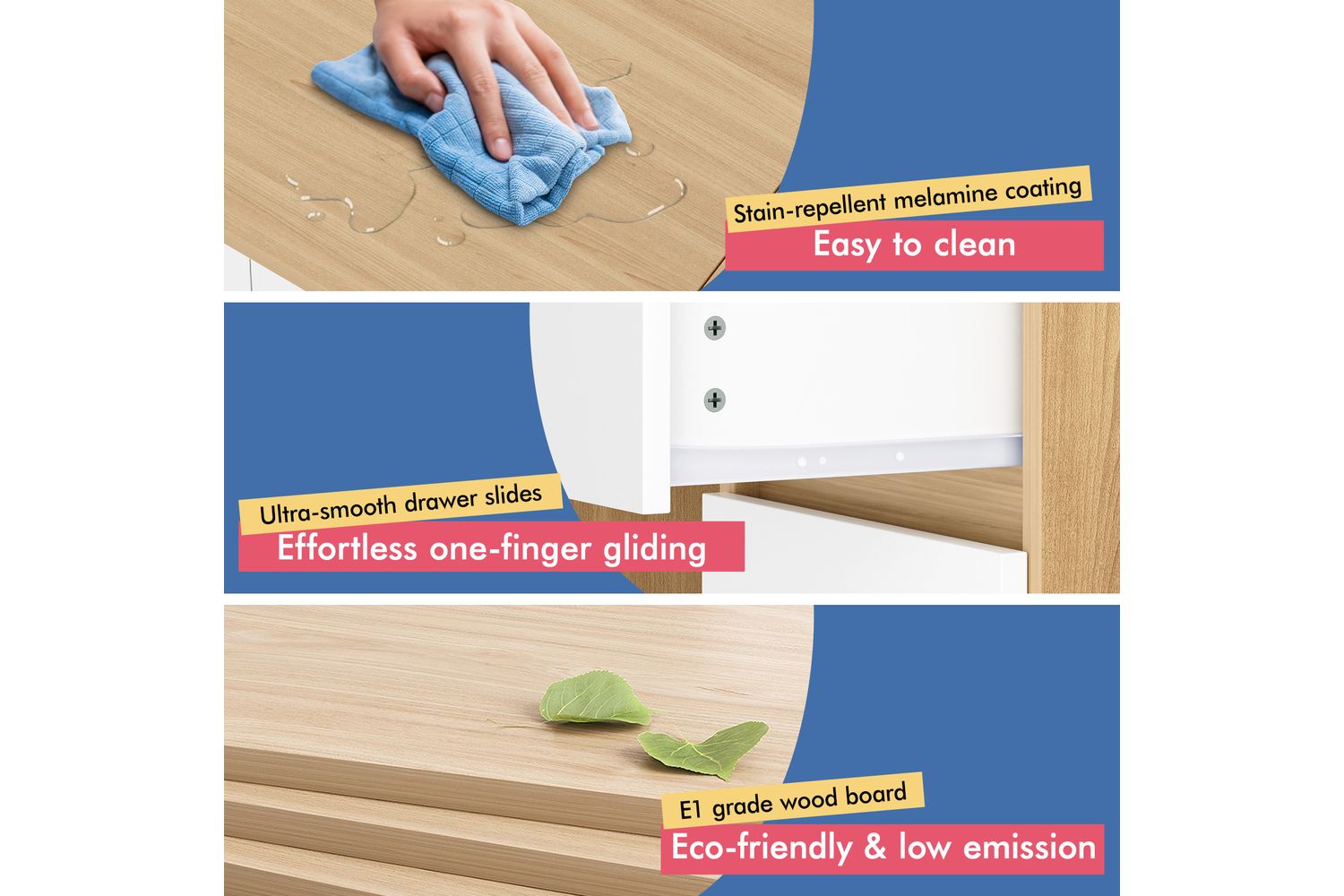 - Frame and Drawers: 15mm particle board