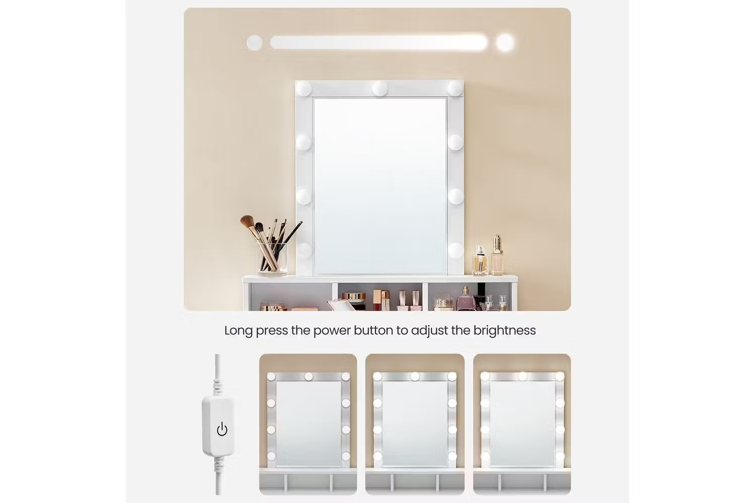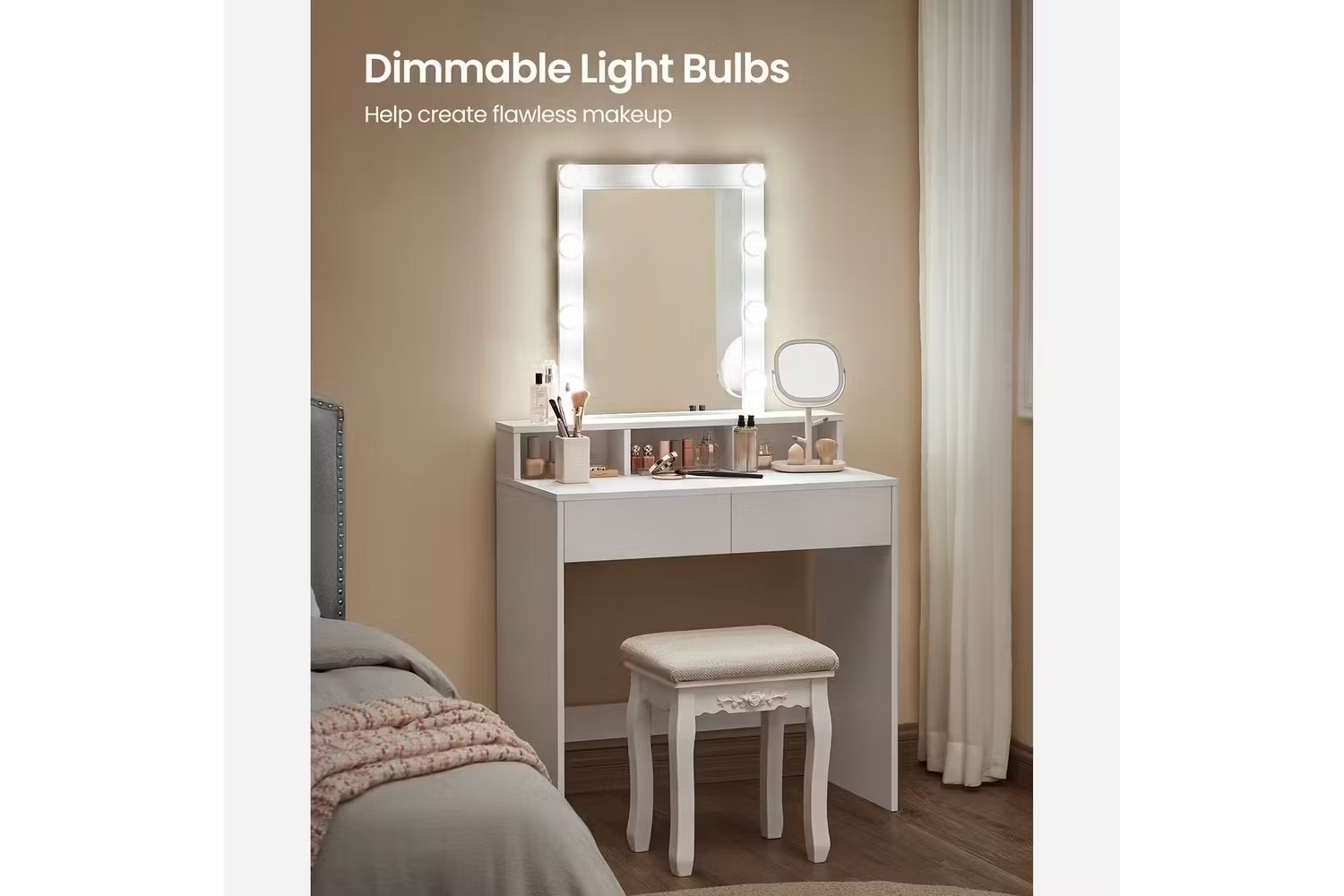 Flawless. Say goodbye to smudged makeup that ruins your entire look. The 9 dimmable bulbs surrounding the mirror brighten up your beauty area and make a perfect eyeliner possible.Everything there: are you tired of searching for your makeup every day? No problem. Eyeshadow and powder are now in the two large drawers, nail polish is well protected in the 3 open compartments and perfume bottles can be placed on the raised shelf.Start the day happily: the modern design and light colour of this cosmetic table will always put a smile on your face. Use your piece of jewellery to try out the latest make-up tricks.Always in top shape: if after applying your make-up you are shocked to find that there are some makeup stains on this dressing table, then we can put your mind at ease. It has a melamine coating that is easy to clean.Contents: a dressing table with lightbulbs, numbered items and easy to follow instructions (English language not guaranteed). You will also receive an anti-tip device and a great opportunity to relax and get ready.Specifications:- Colour: White- Material:Particleboard- Product Size: 80 x 40 x 145 cm (L x W x H)- Product Weight: 24.5 kgPackage Contents:- 1 x Dressing Table-9 x Bulb (1 Spare)- 1 x Accessory Kit- 1 x Anti-Tip Kit- 1 x Instructions