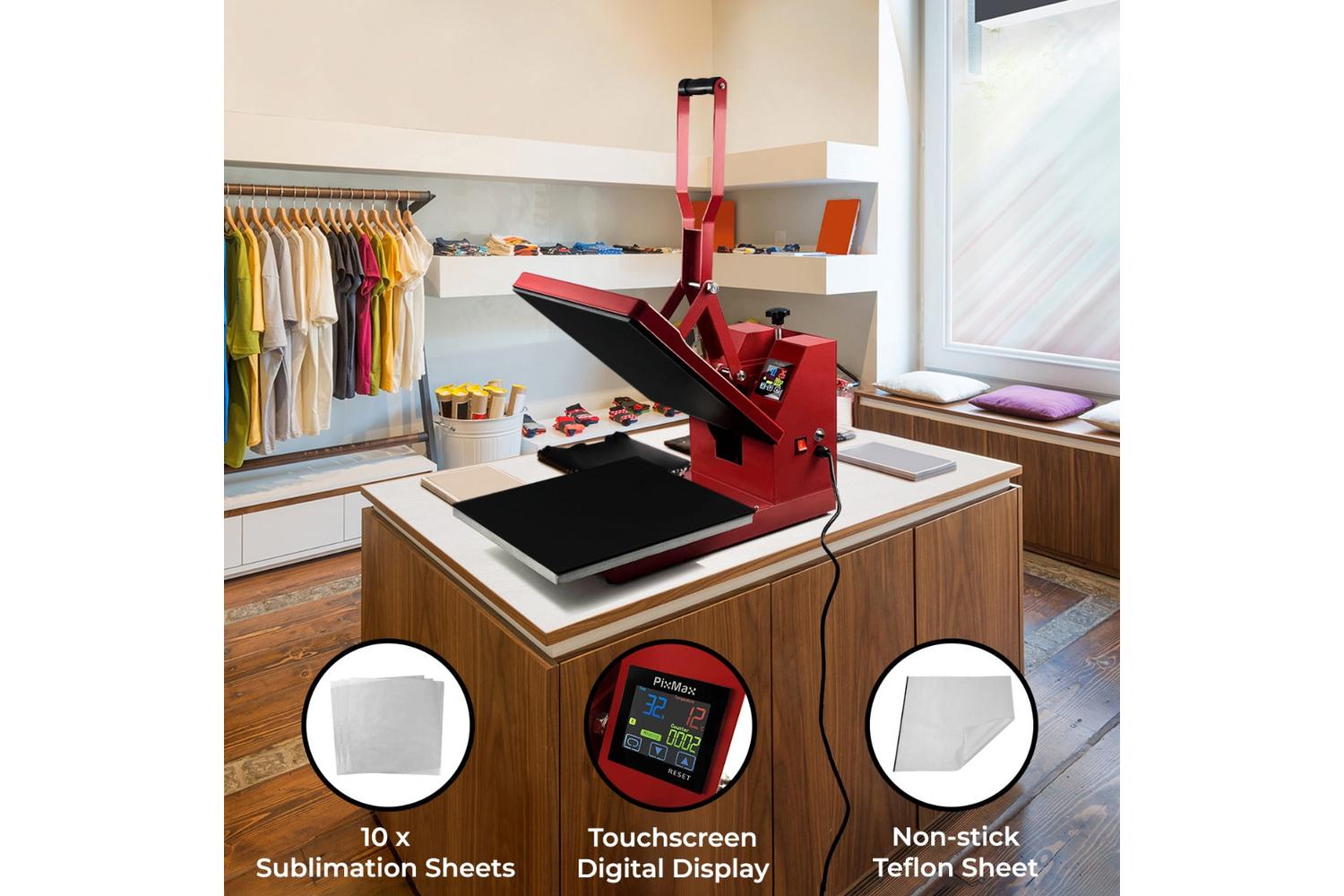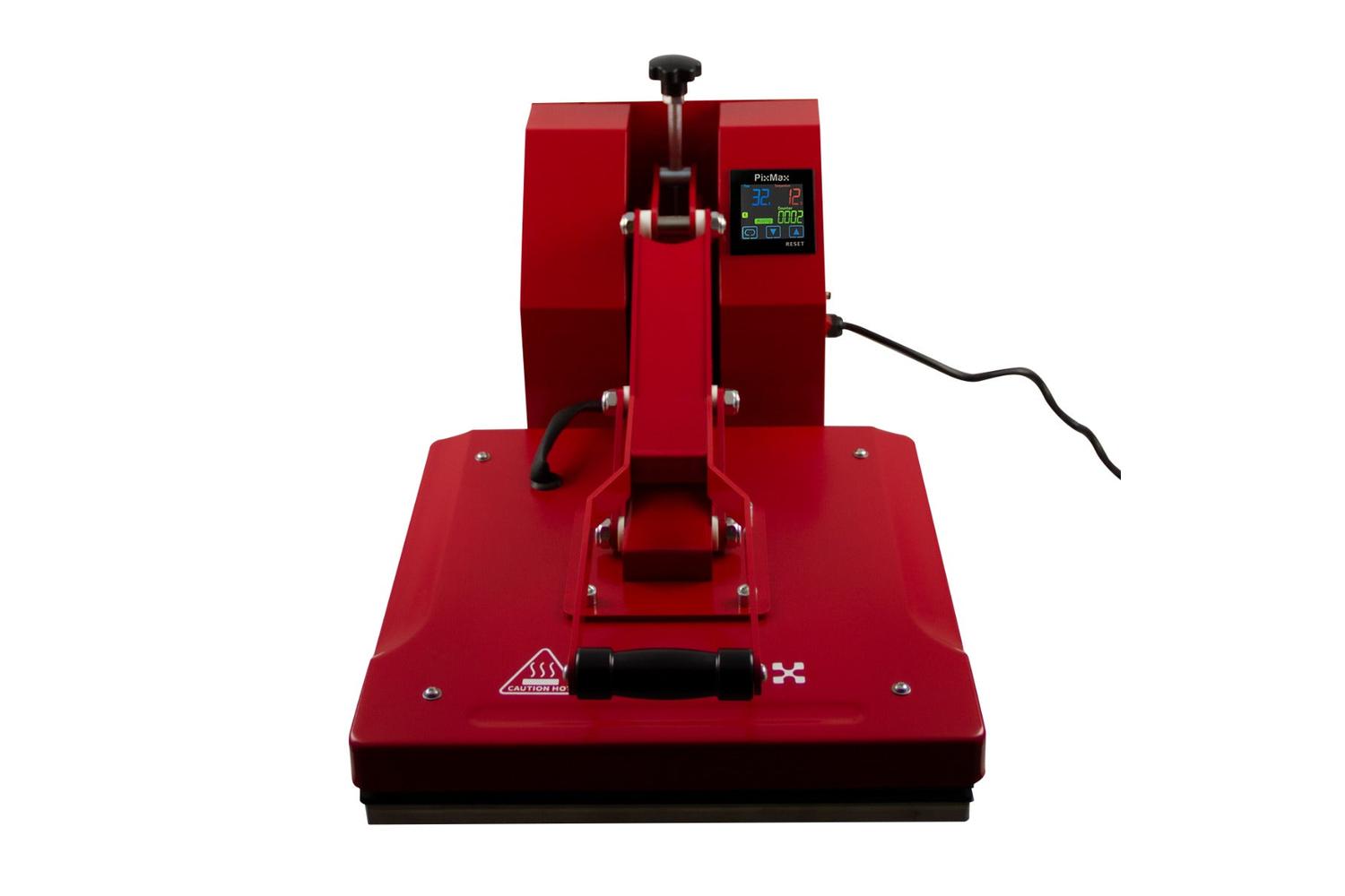 Packed with amazing features such as 38cm x 38cm platen, even heat distribution, touchscreen digital display, and accurate timer control making it effortless to use. Catering for your specifications, the operating heat temperatures can be set between 0°C and 250°C and the pressing time from 0 up to 999 seconds. Thanks to its sleek clam-design and stunning red finish, it effortlessly fits into any workshop or studio environment.