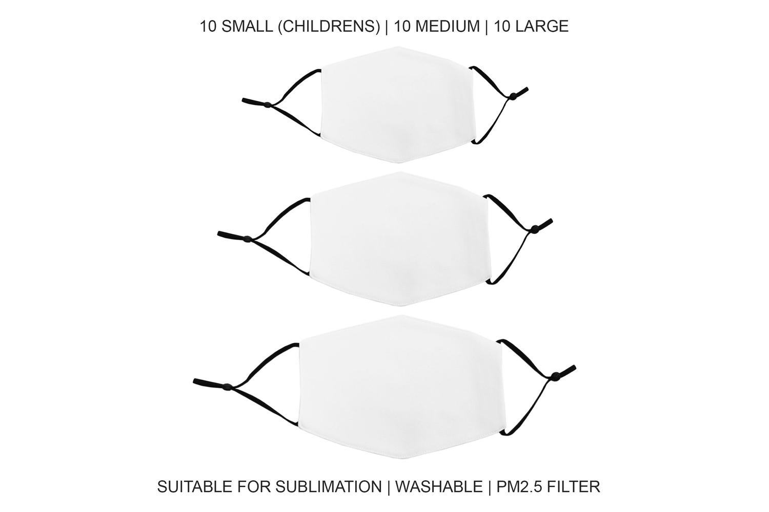 - Pack of 30 mixed sized blank sublimation adjustable face masks;