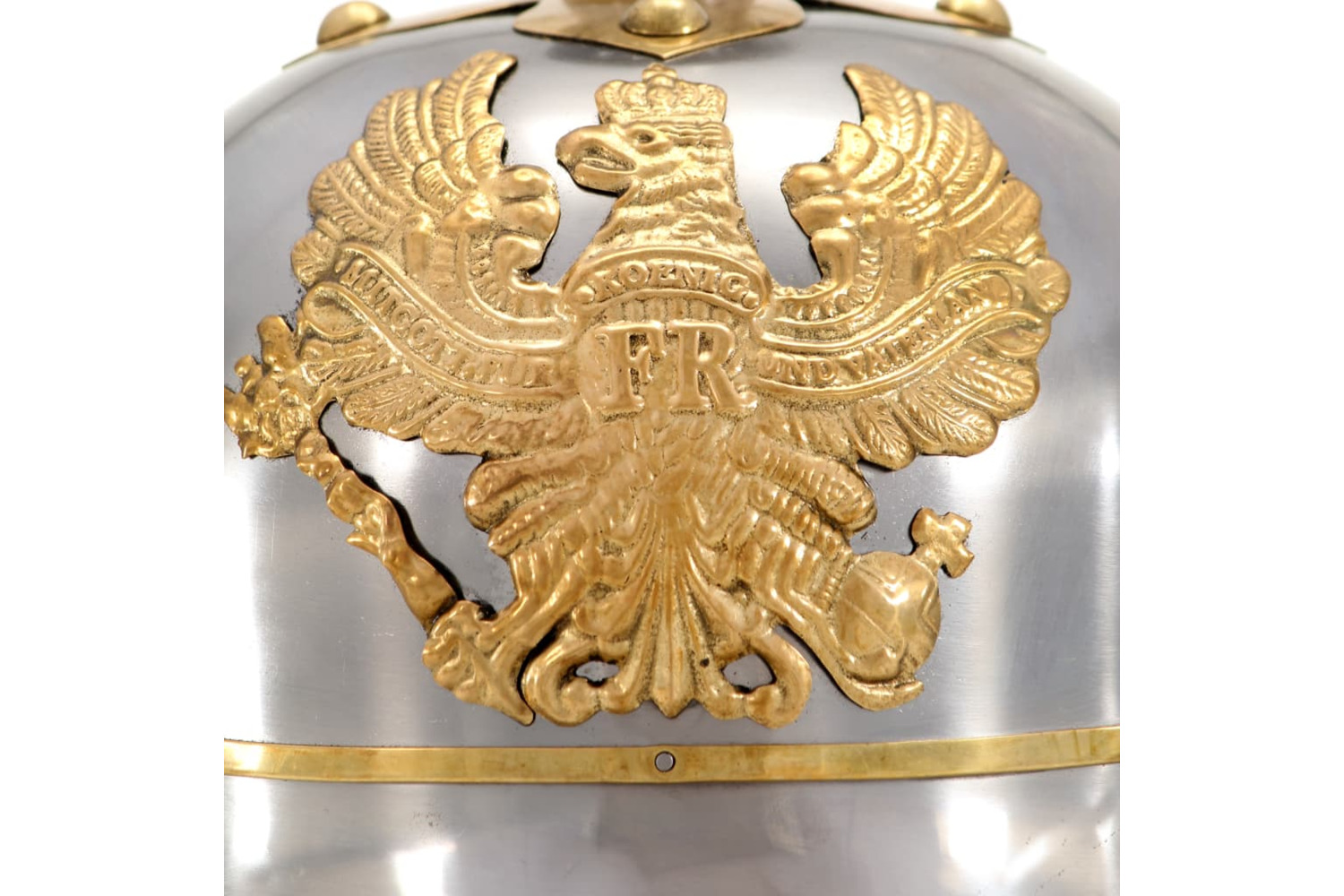 This is a helmet from Grand Duchy of Hesse officer Kaiser Tschako helmet and is an exact replica of an original German soldier helmet. Made of polished 18-gauge steel with brass edges, it combines antique style and sturdy material into an eye-catching helmet, which perfectly matches with your soldier outfit. Additionally, it is also an attractive display piece and is perfect for costumes and events.