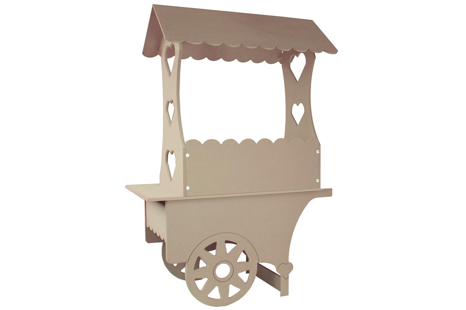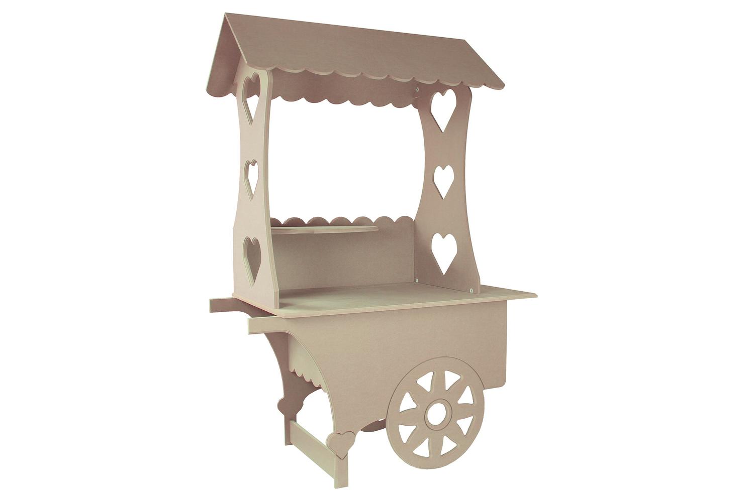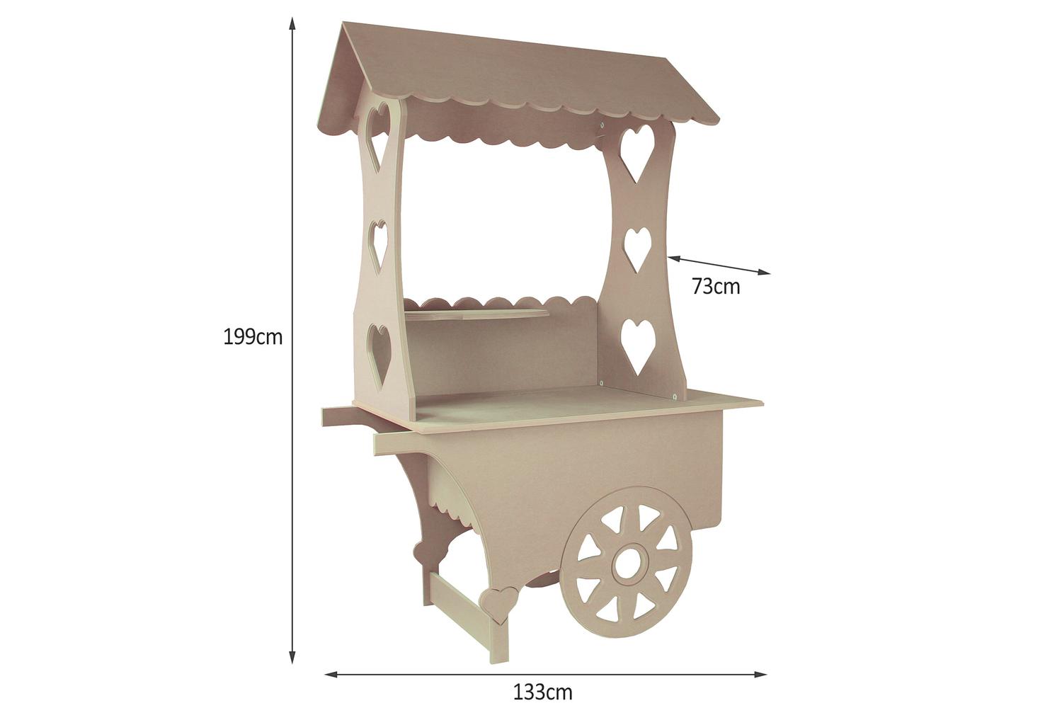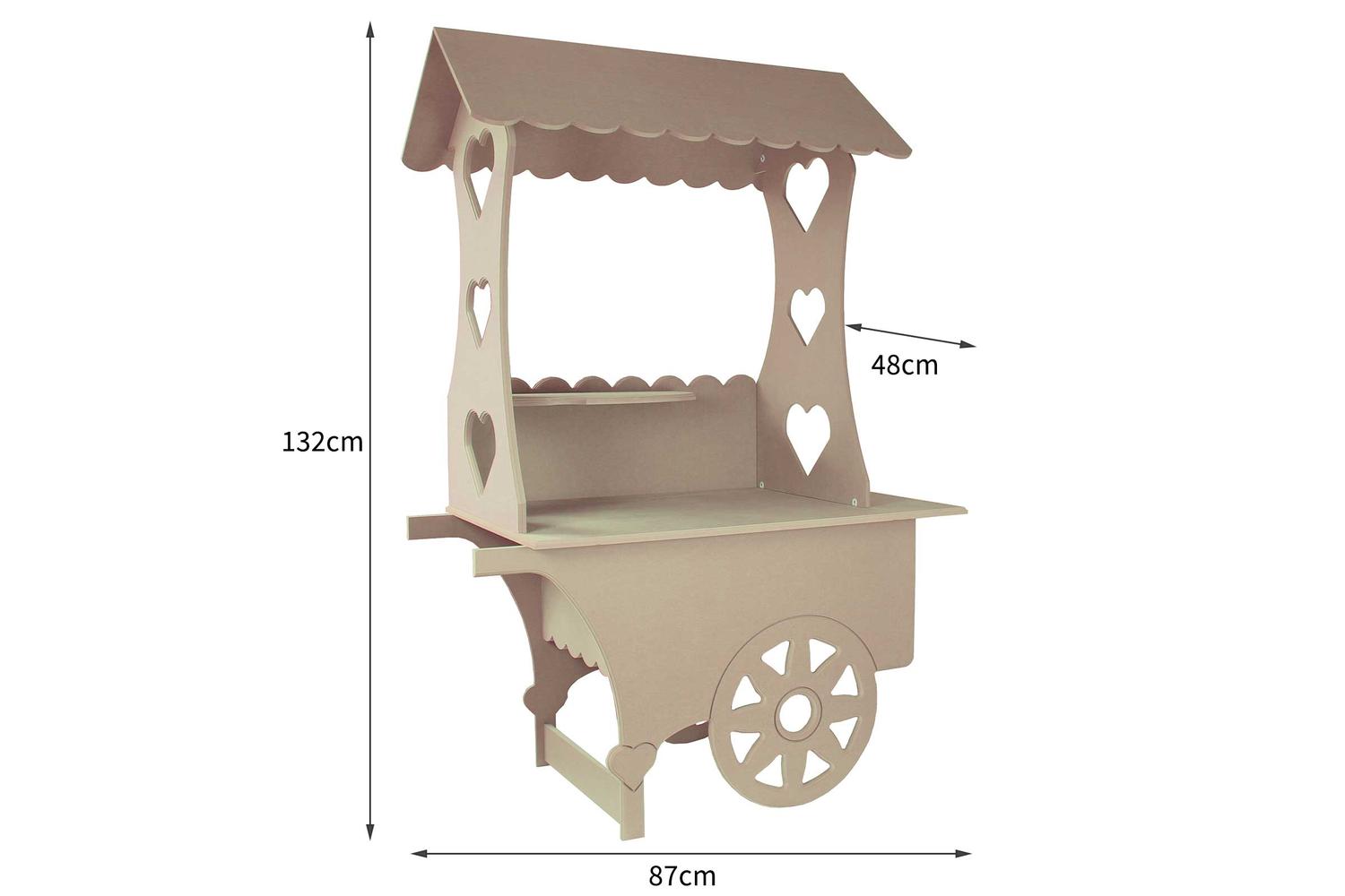 An eye-catching centre piece for weddings, christenings and eventsThe flat pack allows easy DIY assembly - will need just a screwdriverThe carts come in unfinished MDF - ready for customisationTwo different candy cart sizes enhancing decor flexibilityLove heart embellishments realm the side panels and legsAdded shelves, either on the left or right hand side, increases storage utilityIntended for indoor use onlyThe wheels do not move, but designed to support the structure uprightThe