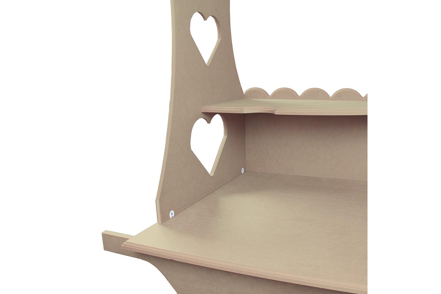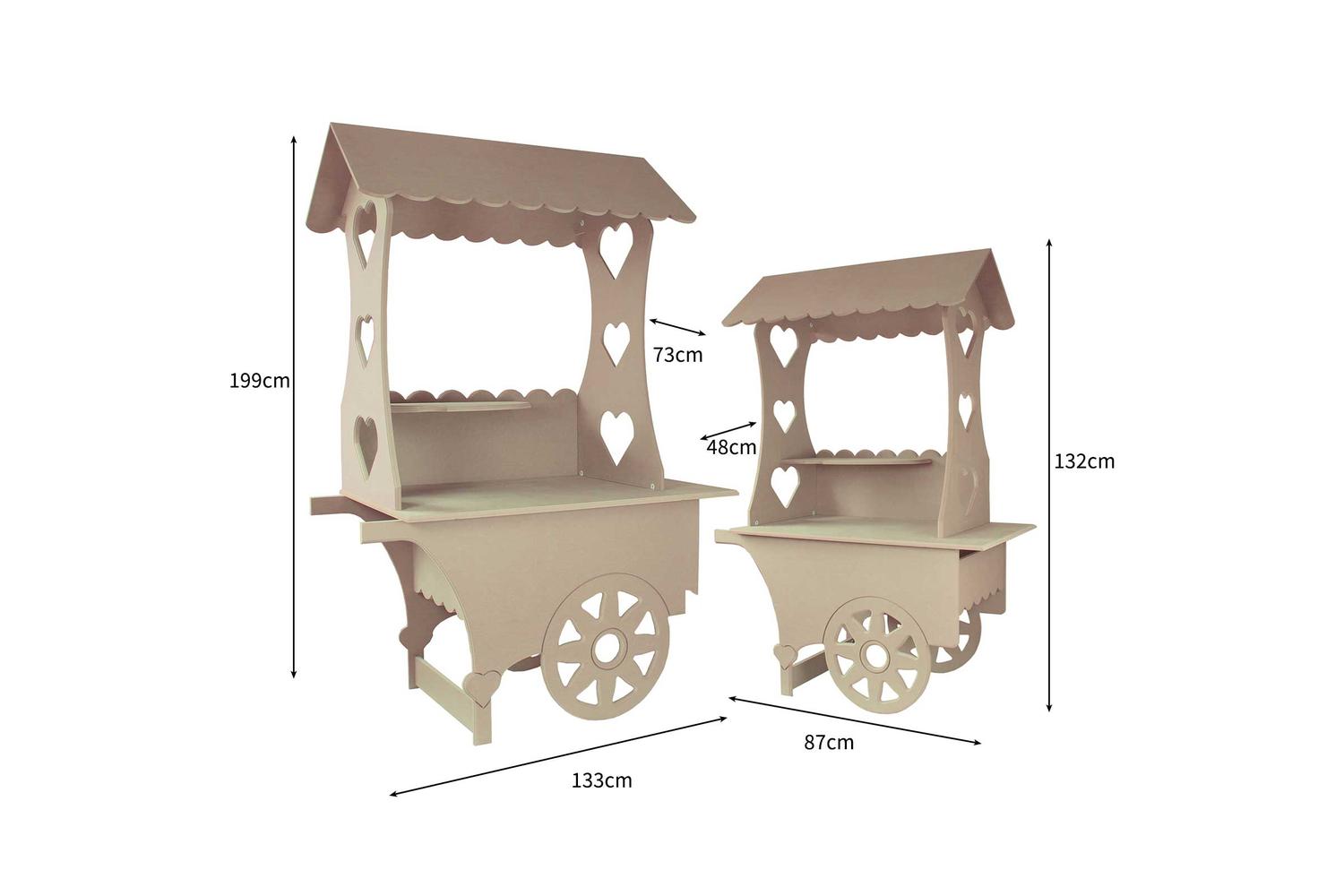 Comprising two adorable candy carts of different sizes, an assembling fid for your confectionery concoctions beckons. Be it cotton candy, popcorn, sweets, desserts, or flowers, these carts can store and display varied items charmingly. The design features delightful love heart details on side panels and legs while the shelves offer flexibility to be positioned on either side. These carts come in plain, unfinished MDF, enabling you the freedom to paint it to suit your event or business.