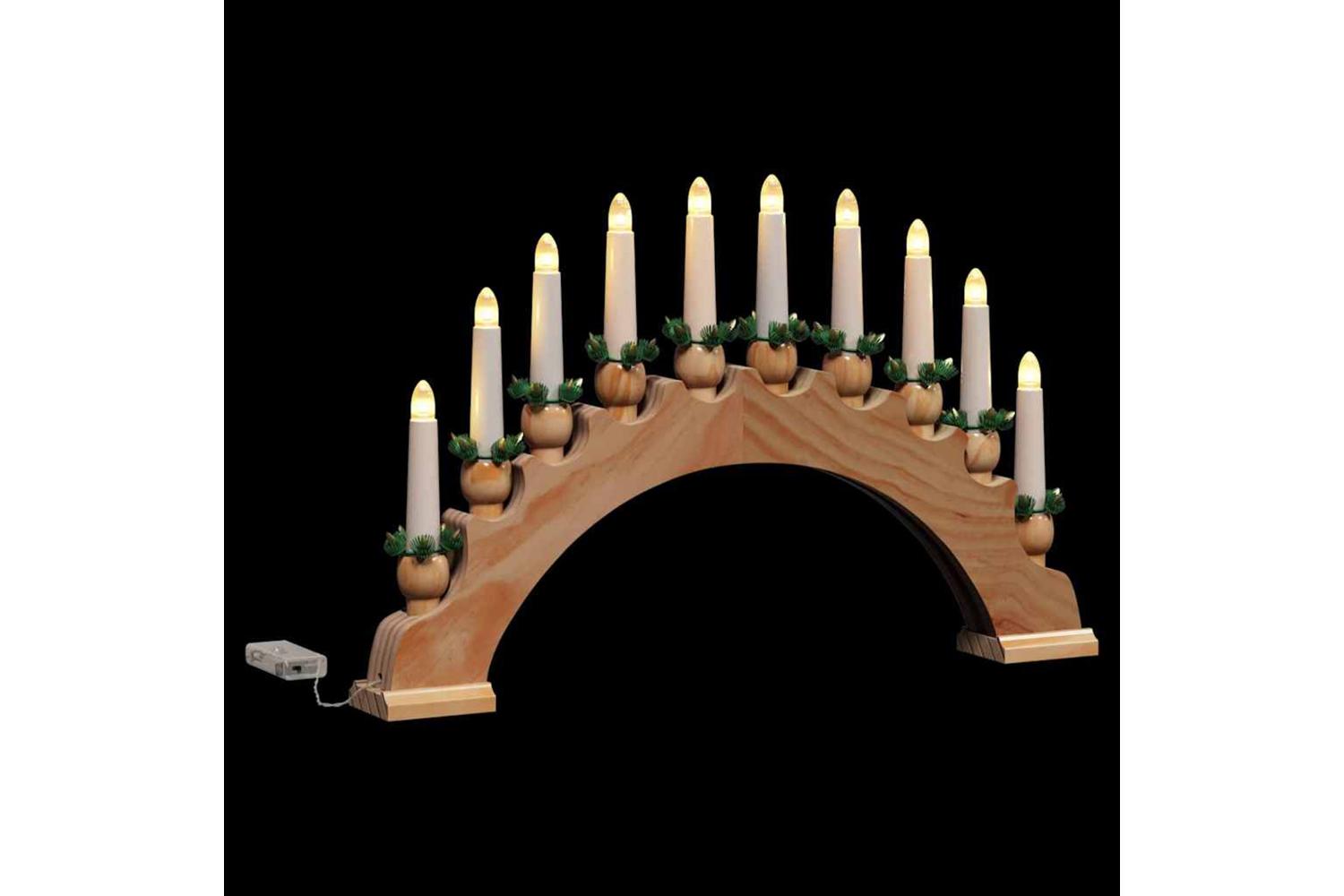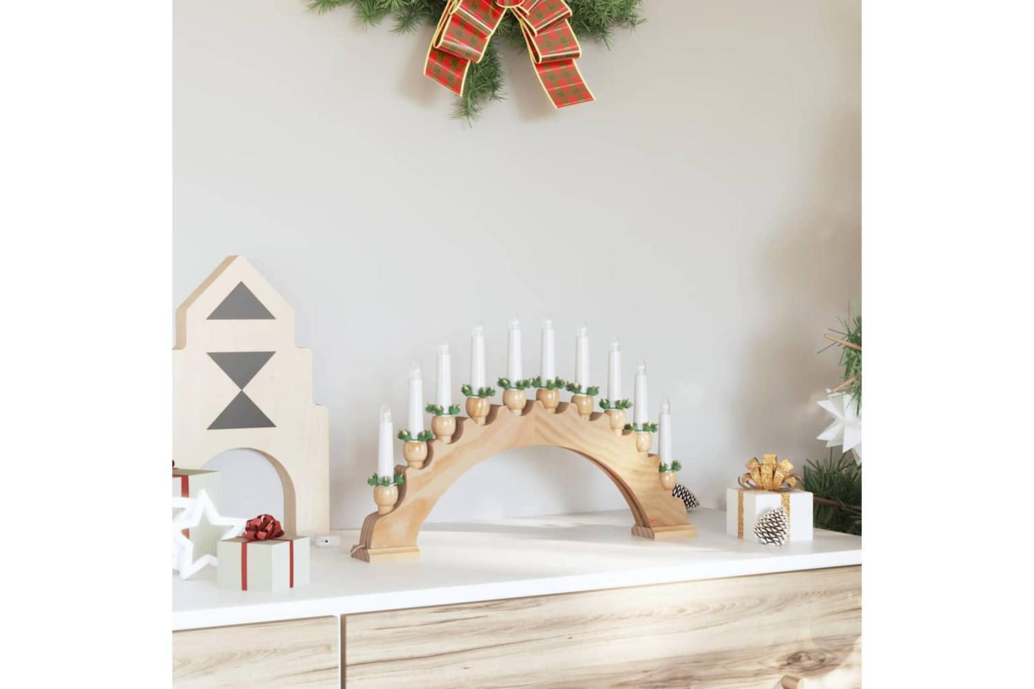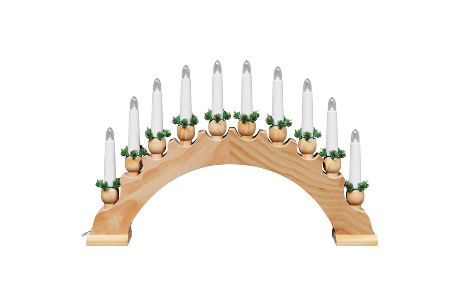 The Christmas Candle Arch with 10 LED Candles beautifully combines tradition and modernity for an enchanting holiday display. Crafted from solid pine wood, this piece embraces the festive spirit, bringing warm ambiance to any indoor space. Designed to sit gracefully on mantels and windowsills, it illuminates your room with a soft, warm white light, creating a cozy environment for family gatherings and seasonal celebrations. This exquisite decorative piece not only enhances the seasonal charm but also offers a touch of nostalgic flair, reminiscent of classic holiday decor traditions.