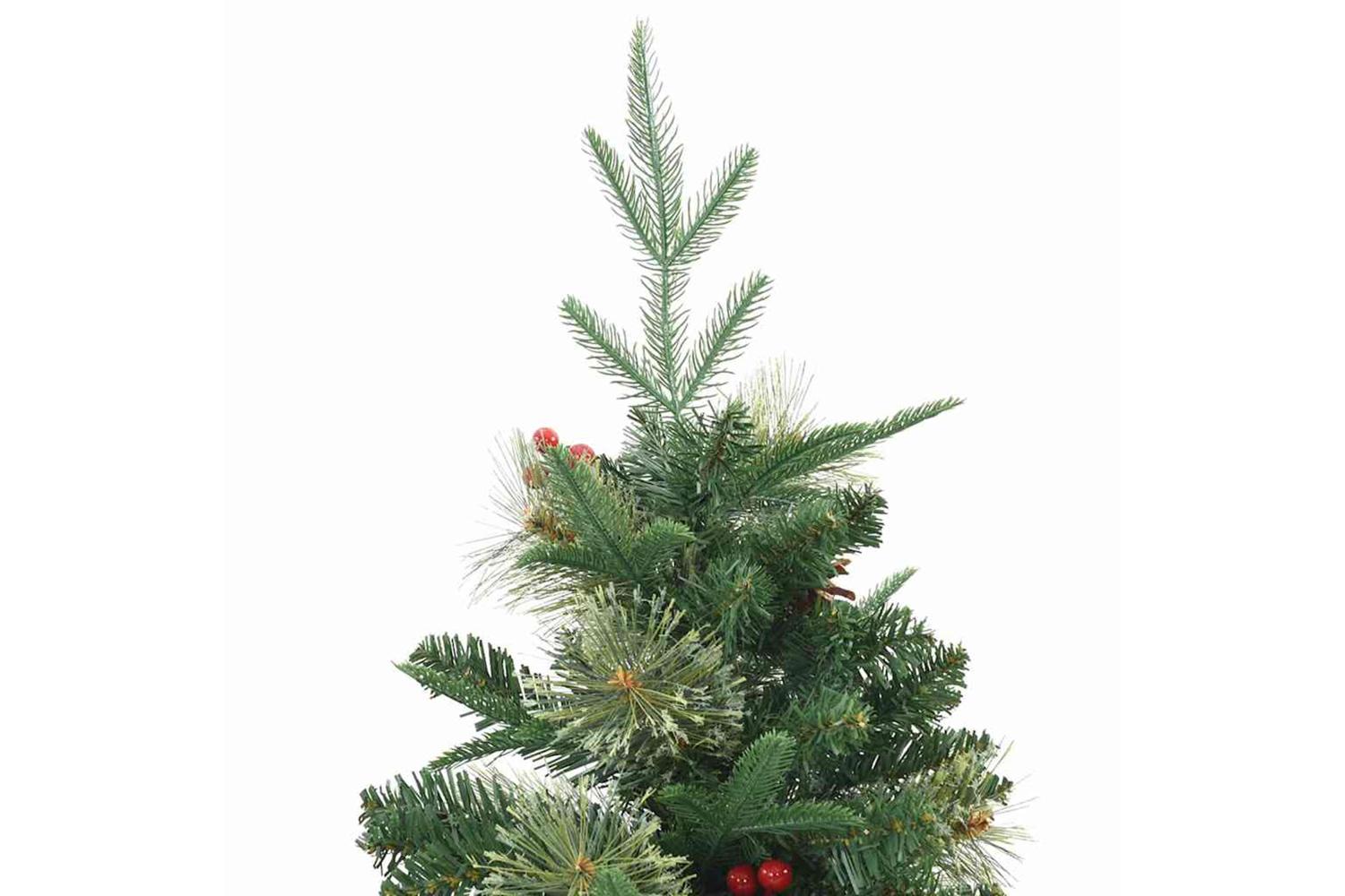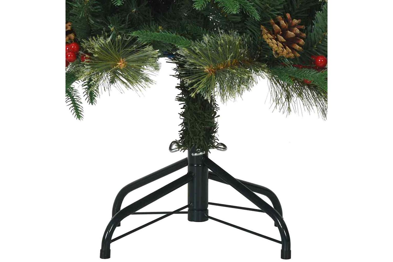 - Decorative Elements: This Christmas tree comes beautifully adorned with pine corns and bright red berries that add a festive and natural touch. The thoughtfully placed decorations maintain a harmonious balance, offering a cohesive and stylish holiday theme. These elements also offer visual depth, enhancing the overall appearance whether placed indoors or in a covered outdoor area.