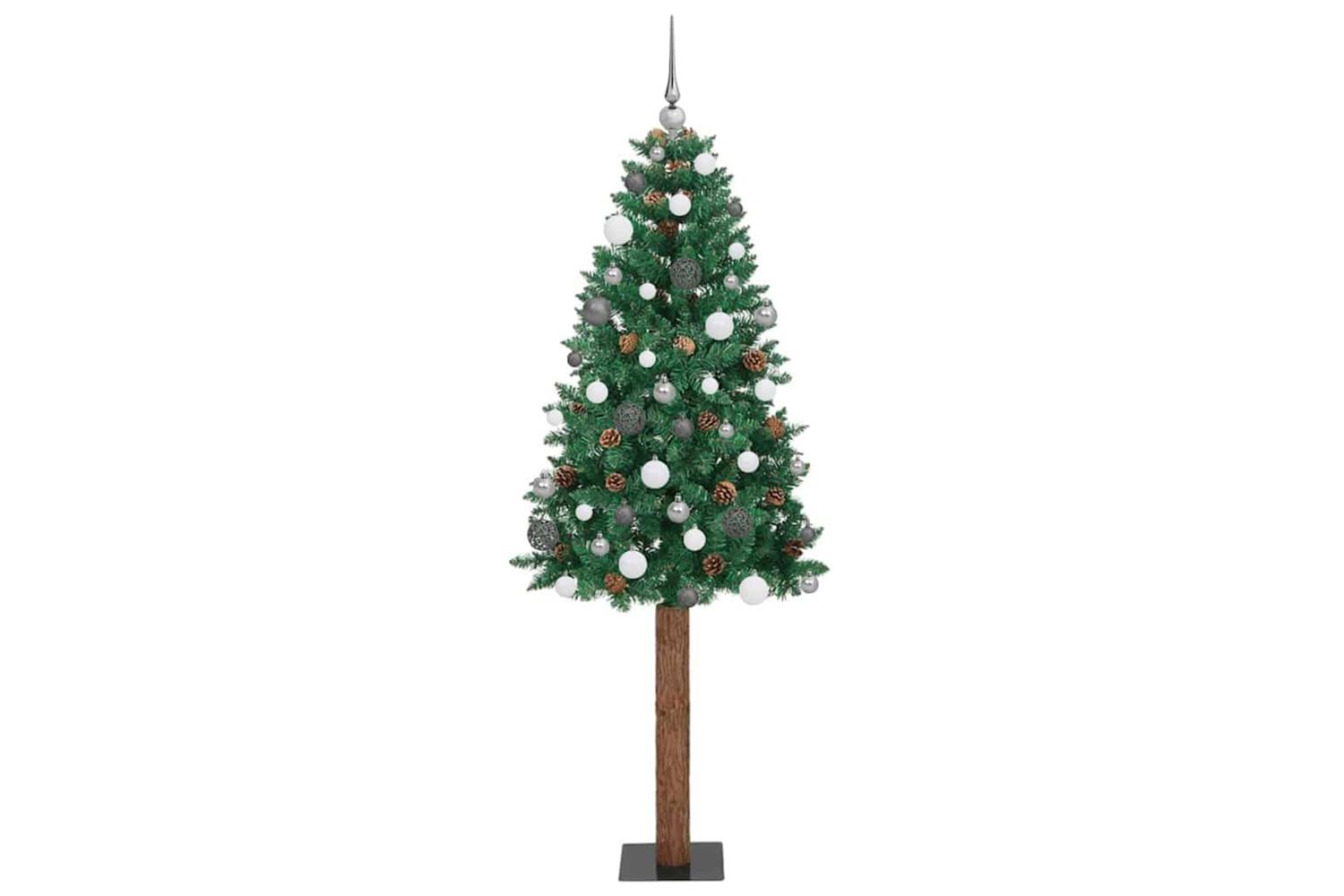 - Decorative with pine cones and ornament balls, Lifelike branch tips, Real wood trunk