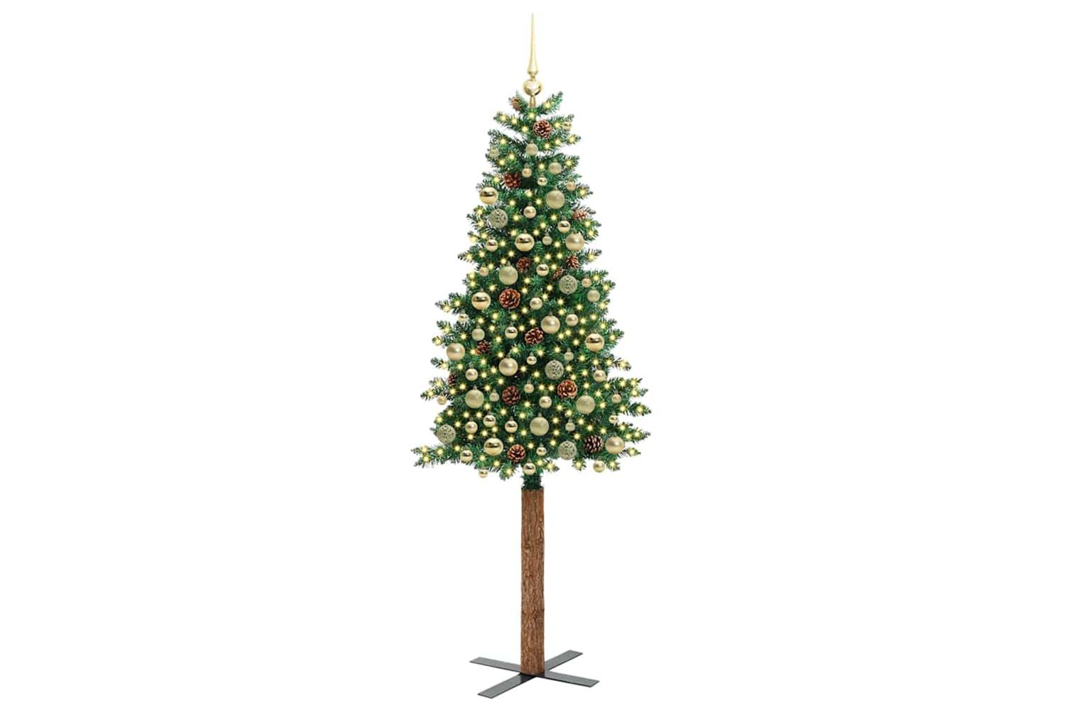 - Decorative with pine cones and ornament balls, Lifelike branch tips, Real wood trunk