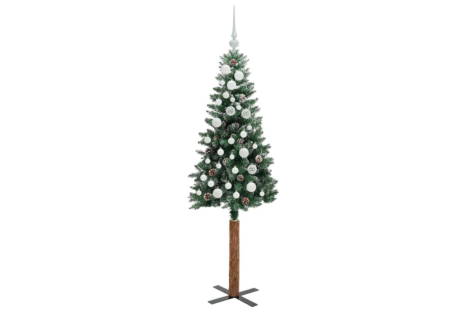 - Decorative with pine cones and ornament balls, Lifelike branch tips with frosted snow, Real wood trunk