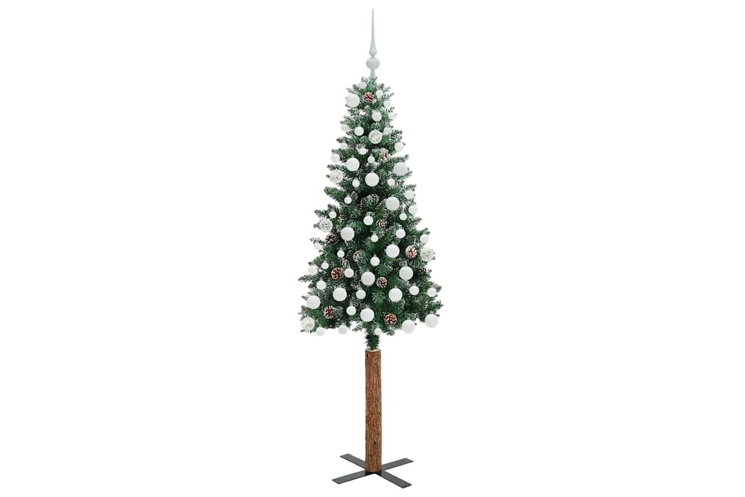 - Decorative with pine cones and ornament balls, Lifelike branch tips with frosted snow, Real wood trunk