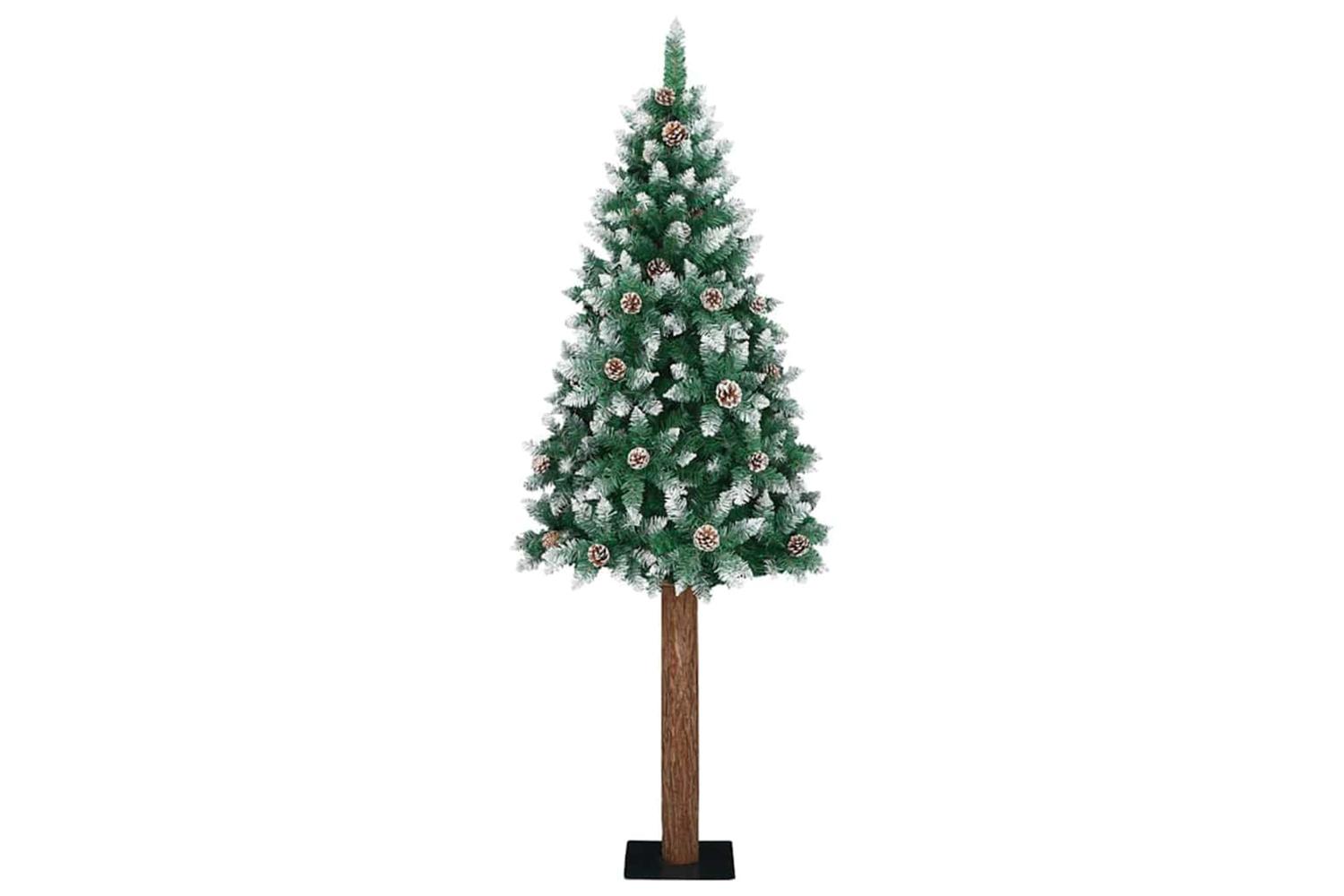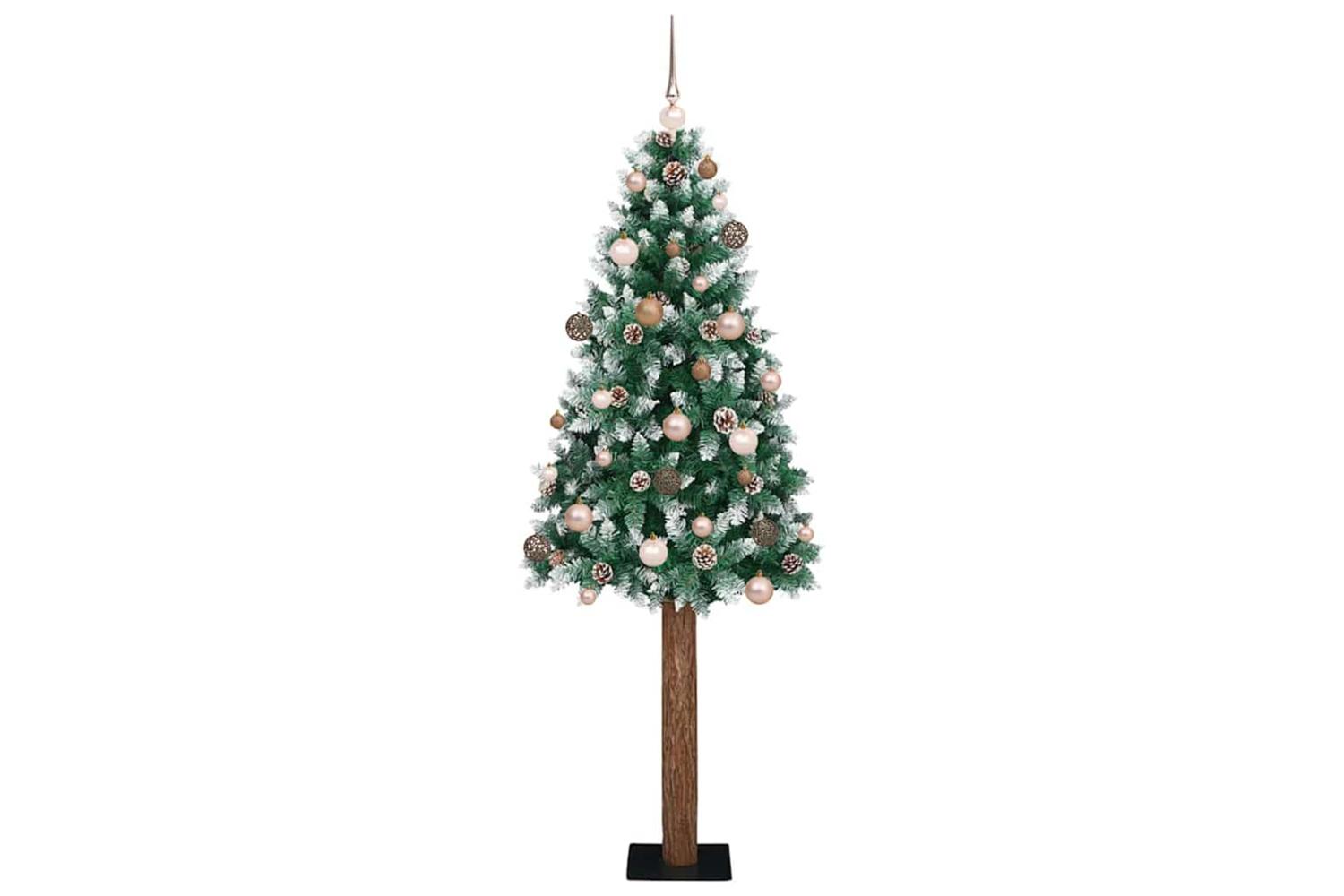 - Decorative with pine cones and ornament balls, Lifelike branch tips with frosted snow, Real wood trunk