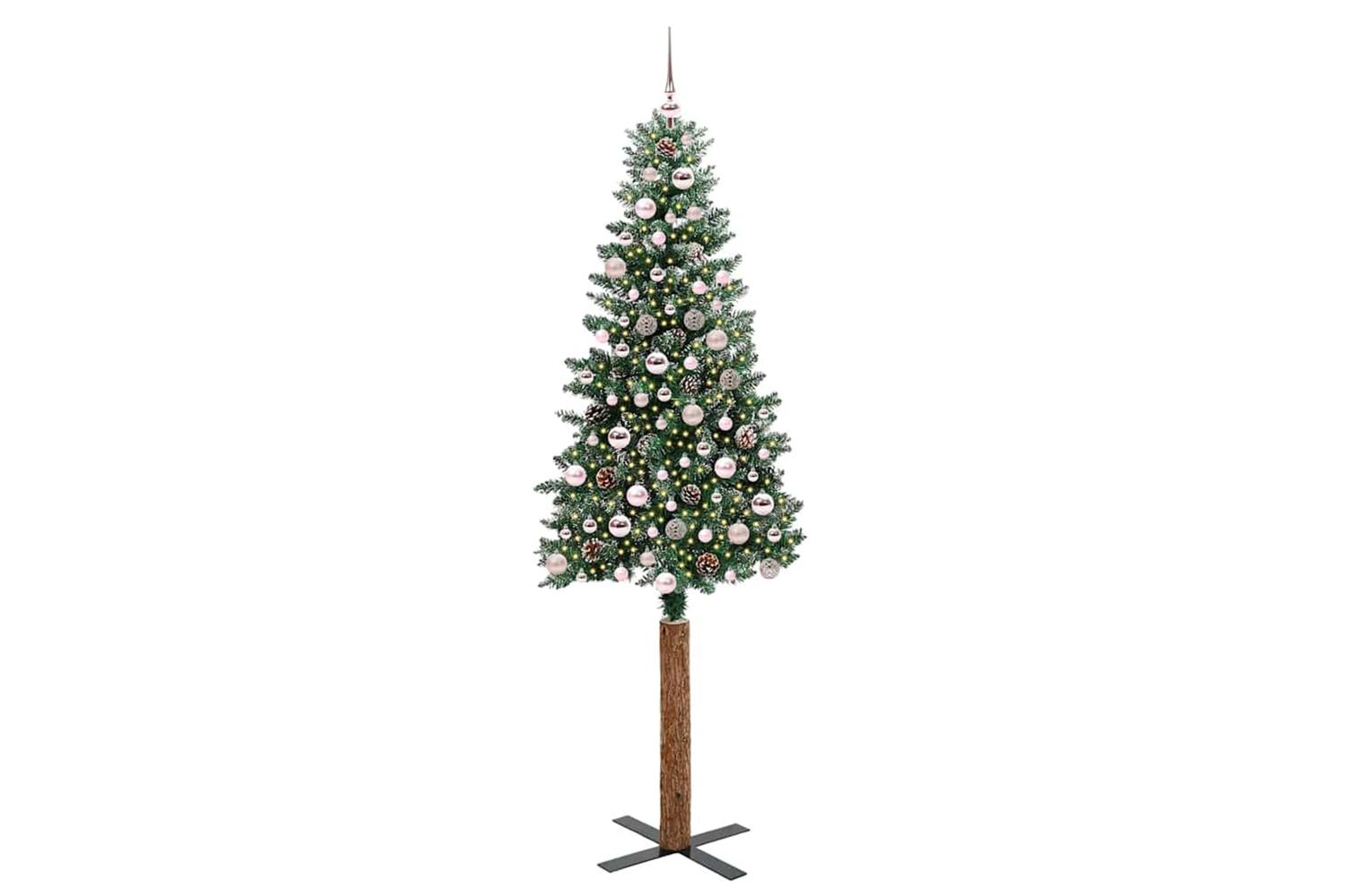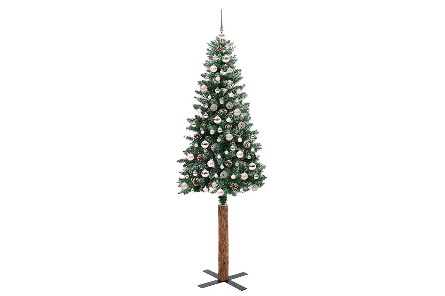 - Decorative with pine cones and ornament balls, Lifelike branch tips with frosted snow, Real wood trunk