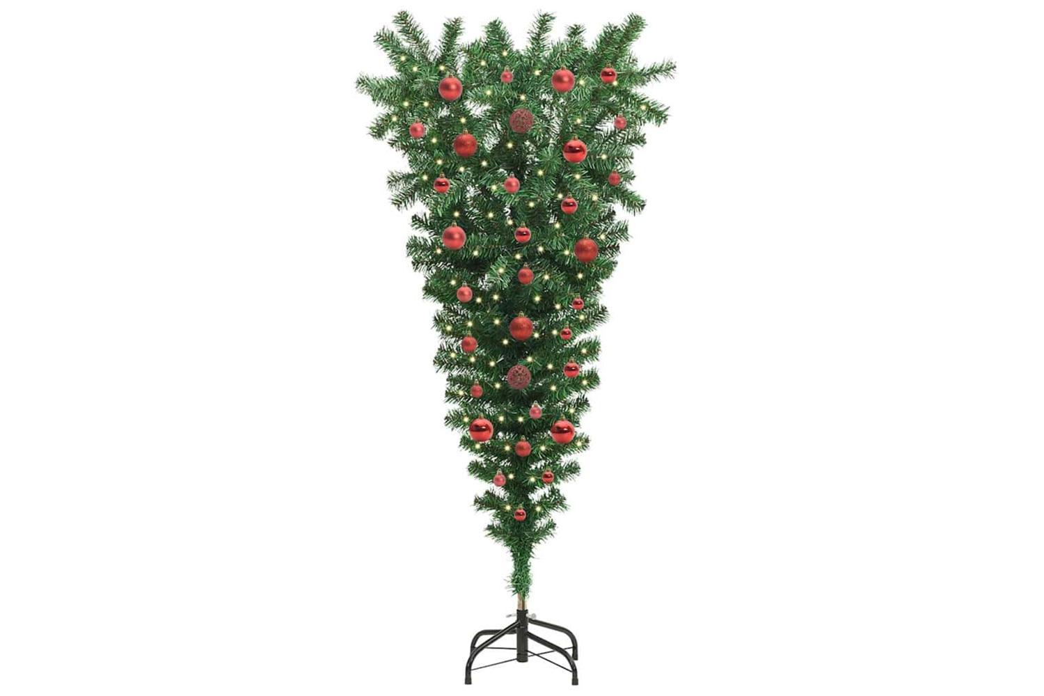 This upside-down artificial pre-lit Christmas tree offers a striking and modern twist to traditional holiday decor. Its unique inverted design is complimented by built-in LED lights, creating an eye-catching centerpiece. The tree's green PVC construction ensures a textured and lifelike appearance, making it a perfect fit for any living room environment during the holiday season. With a convenient USB connectivity feature and a reusable design, this tree is ready to enhance the festive charm of your home, offering an inventive approach to seasonal decoration.