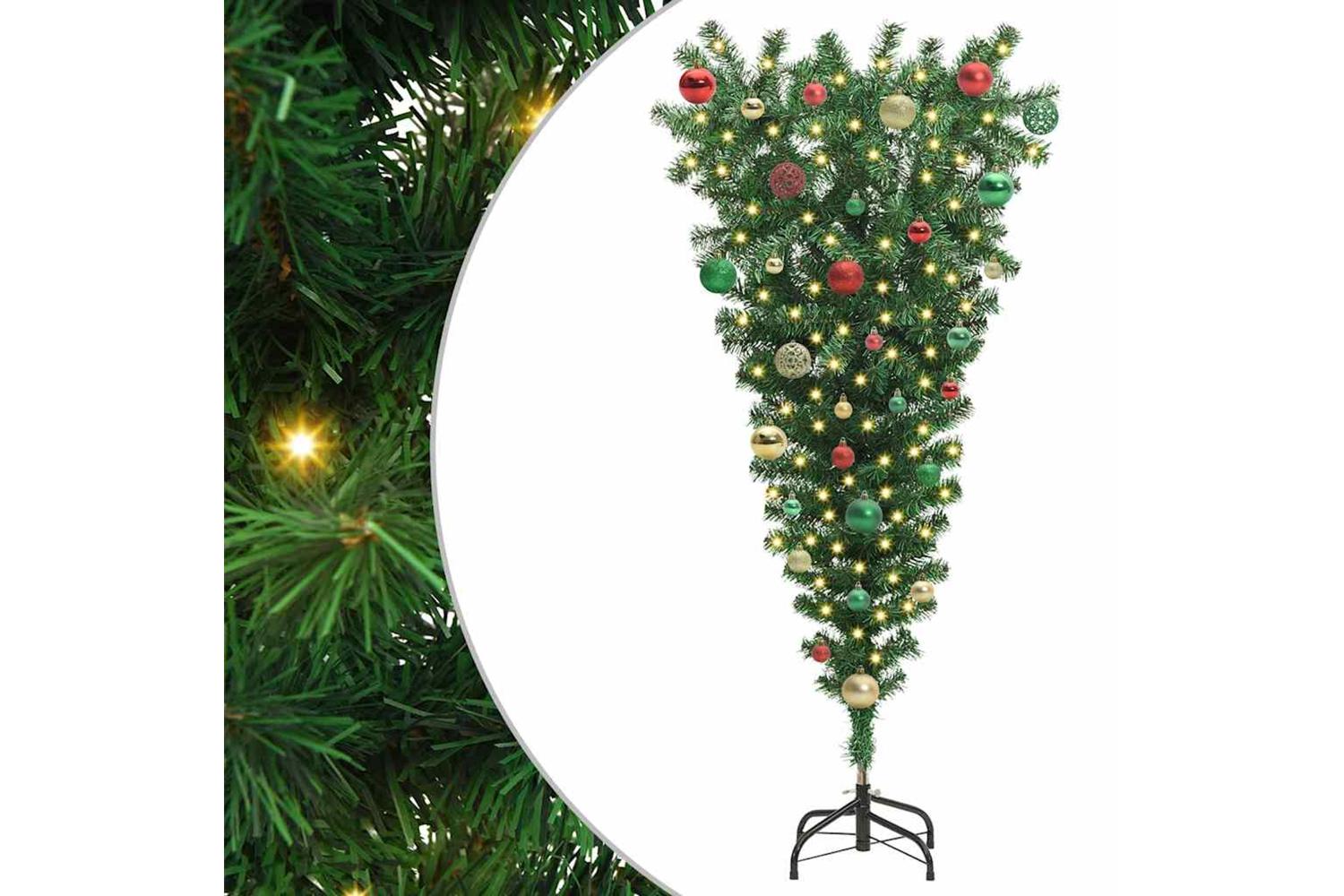 This upside-down artificial pre-lit Christmas tree offers a striking and modern twist to traditional holiday decor. Its unique inverted design is complimented by built-in LED lights, creating an eye-catching centerpiece. The tree's green PVC construction ensures a textured and lifelike appearance, making it a perfect fit for any living room environment during the holiday season. With a convenient USB connectivity feature and a reusable design, this tree is ready to enhance the festive charm of your home, offering an inventive approach to seasonal decoration.