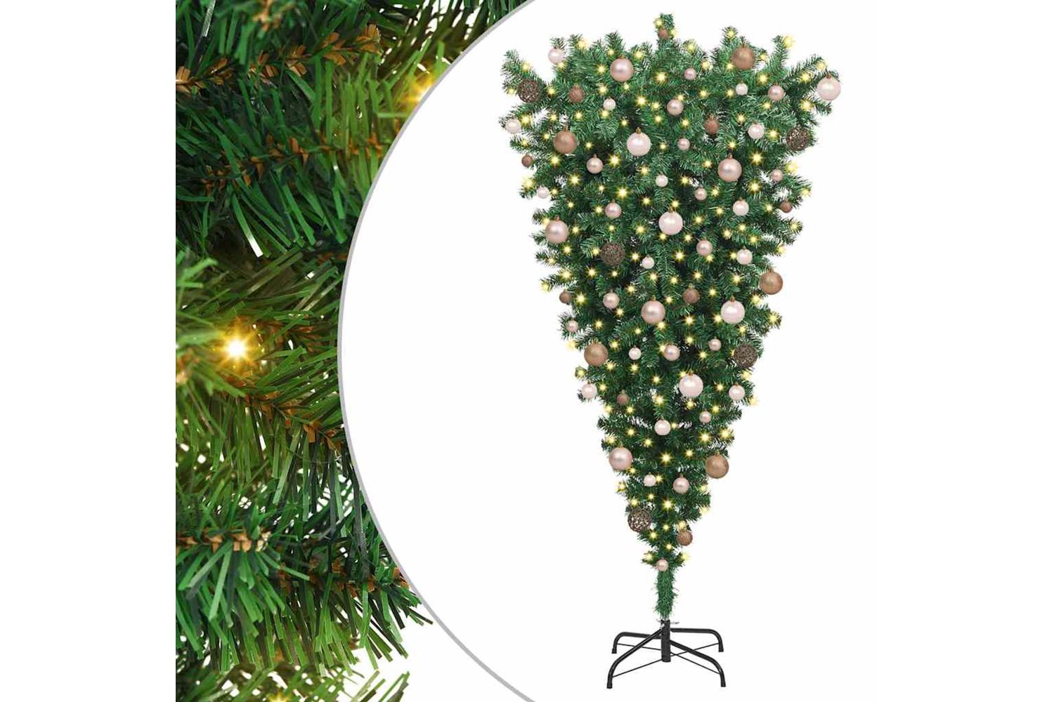 This upside-down artificial pre-lit Christmas tree offers a striking and modern twist to traditional holiday decor. Its unique inverted design is complimented by built-in LED lights, creating an eye-catching centerpiece. The tree's green PVC construction ensures a textured and lifelike appearance, making it a perfect fit for any living room environment during the holiday season. With a convenient USB connectivity feature and a reusable design, this tree is ready to enhance the festive charm of your home, offering an inventive approach to seasonal decoration.