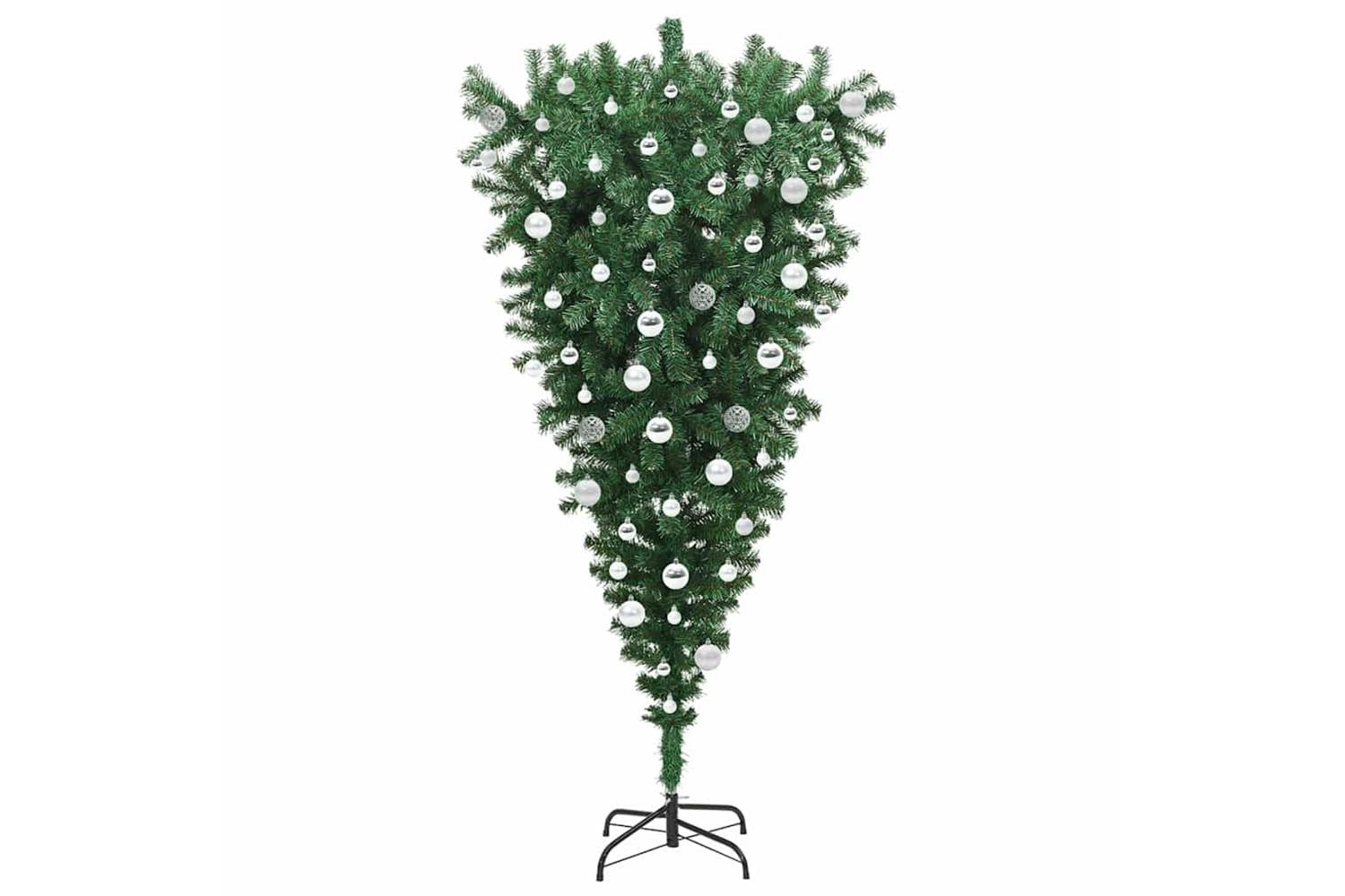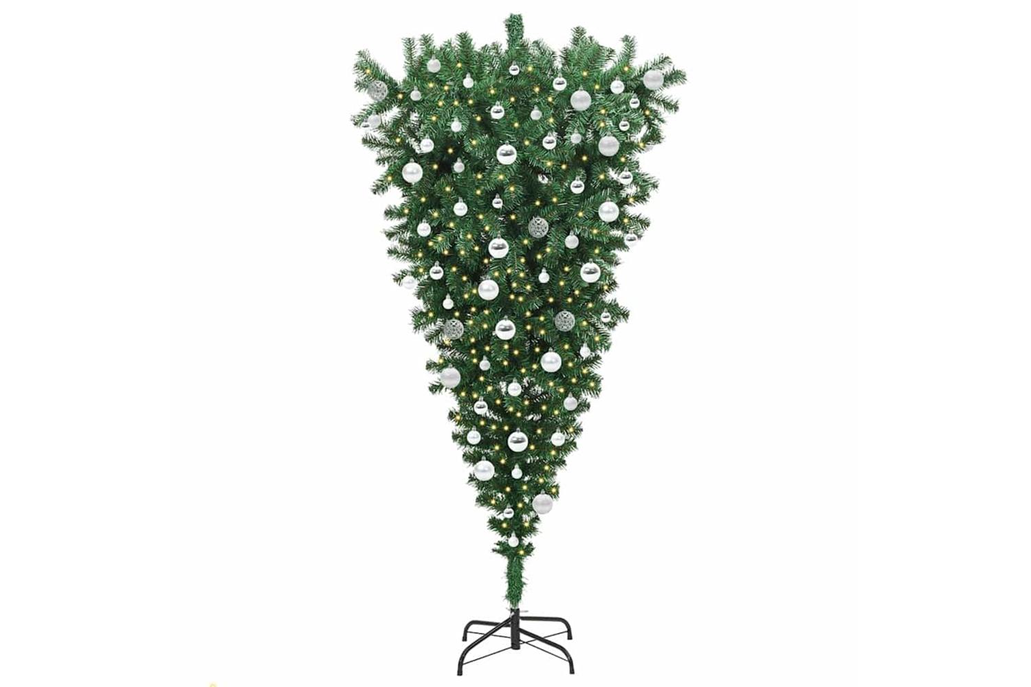 This upside-down artificial pre-lit Christmas tree offers a striking and modern twist to traditional holiday decor. Its unique inverted design is complimented by built-in LED lights, creating an eye-catching centerpiece. The tree's green PVC construction ensures a textured and lifelike appearance, making it a perfect fit for any living room environment during the holiday season. With a convenient USB connectivity feature and a reusable design, this tree is ready to enhance the festive charm of your home, offering an inventive approach to seasonal decoration.