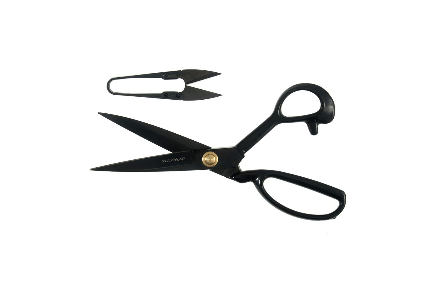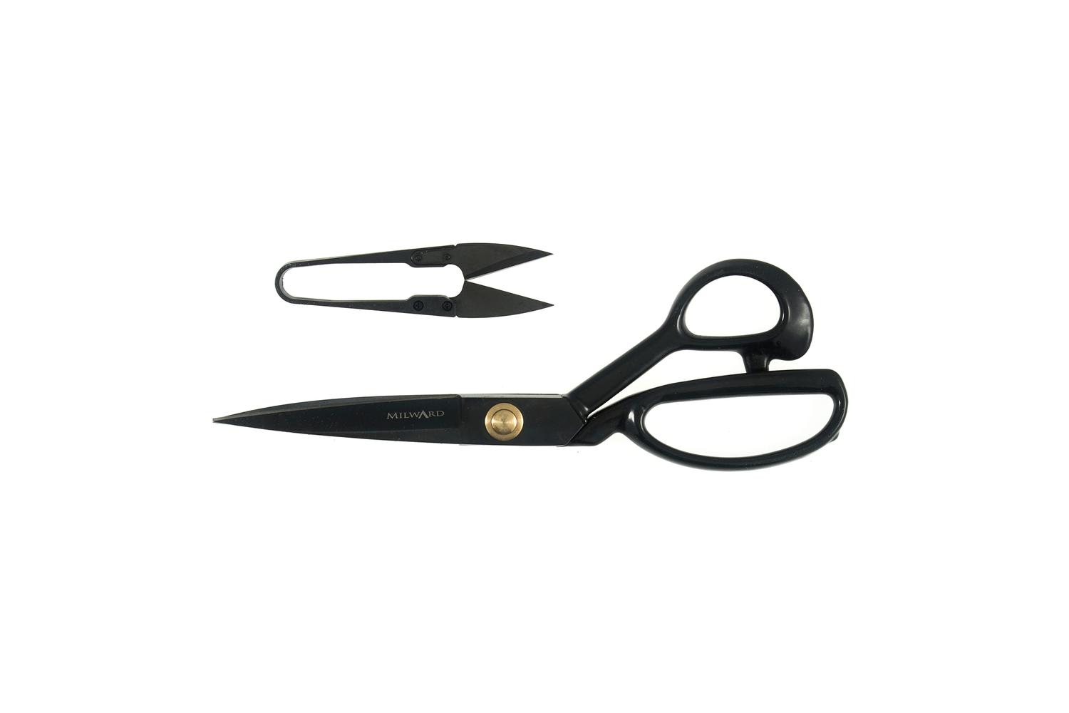 Beautiful Milward gift set containing premium quality, heavy duty steel scissors and accessories, a perfect addition to any sewing box. Dressmaking scissors, 23cm (9in) and coordinating thread snips, 10cm (4in). Comfortable ergonomic handles in black PVC. Presented in a kraft paper gift box with plastic lid. Do not wash. To clean, wipe with anti-rust oil.
