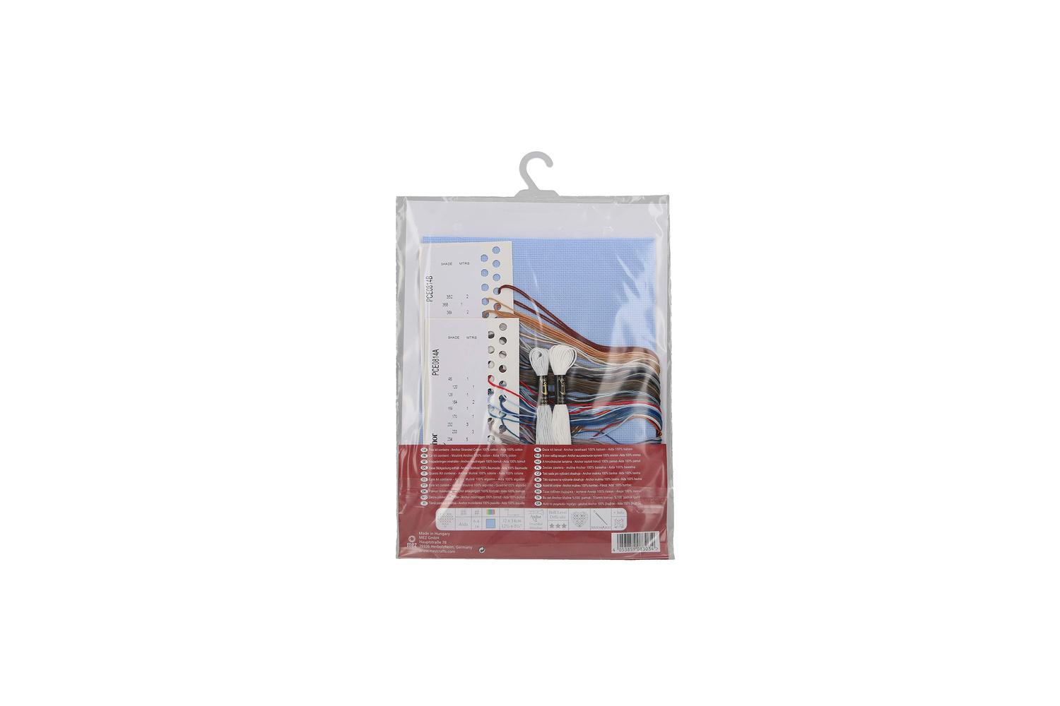Description: Counted cross stitch design. Kit includes: 16 count, blue, cotton, aida fabric; Anchor stranded cotton threads; needle; large-square charted design; frontsheet picture and instructions. Approximate finished size: (w/h) 32 x 14cm or 12.6 x 5.5in. Skill level: 3.