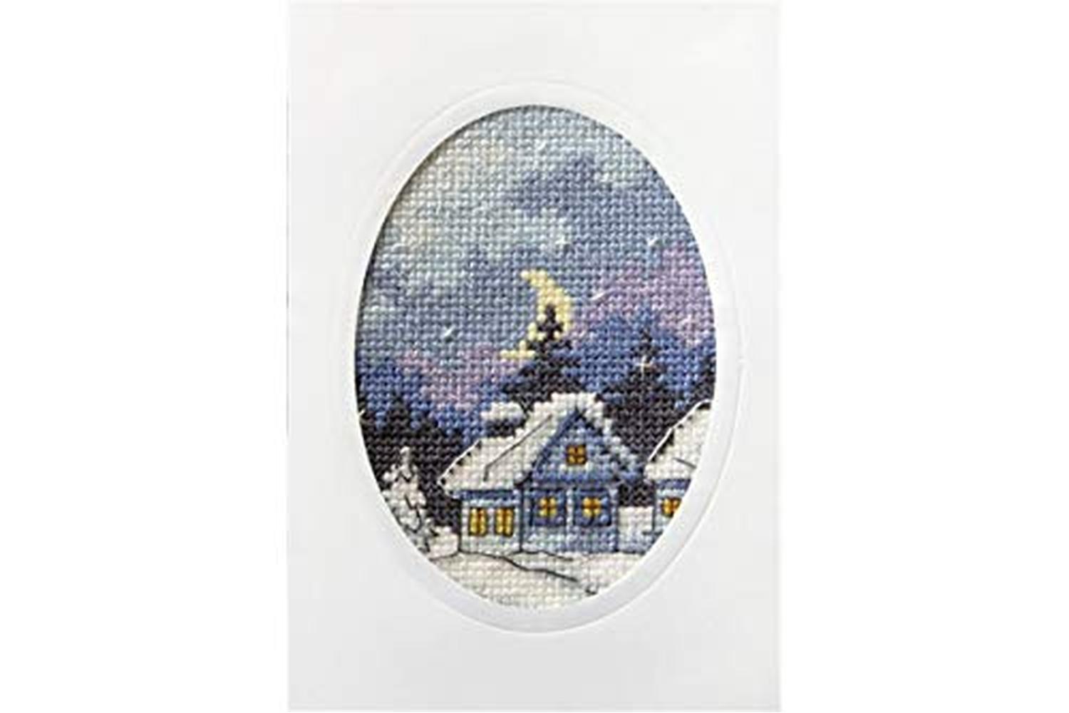 Description: Christmas cross stitch card. Kit includes: Zweigart, cotton, 14 count, printed aida fabric; DMC Mouliné stranded cotton threads; needle; blank card with envelope and instructions. Approximate finished size: (w/h) 10.5 x 15cm or 4 x 6ins