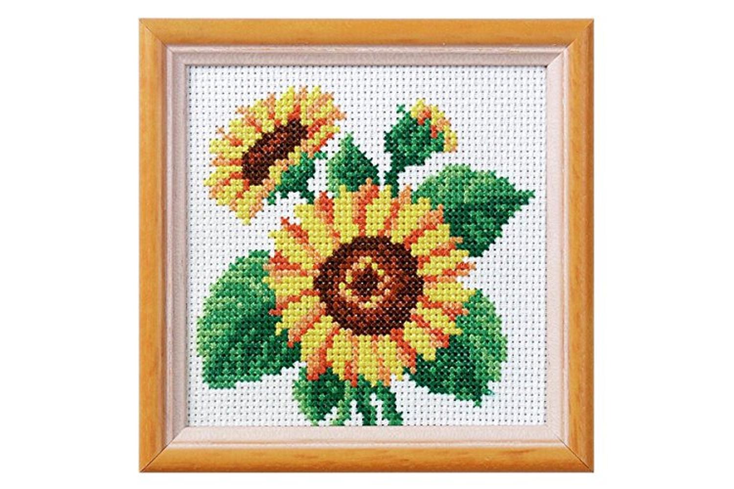 Description: Floral cross stitch design. Kit includes: Zweigart, cotton, 14 count, printed aida fabric; DMC Mouliné stranded cotton threads; needle and instructions. Approximate finished size: (w/h) 11 x 11cm or 4.3 x 4.3in.