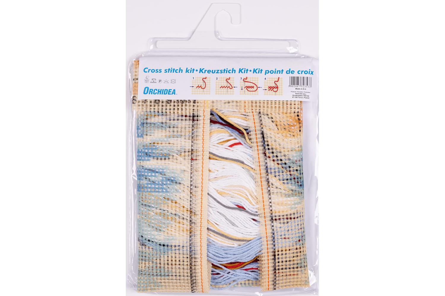 Description: Cushion with cross stitch design. Kit includes: Zweigart, cotton, 4.5 count, printed canvas; acrylic yarn; needle; frontsheet picture, chart and instructions. Approximate finished size: (w/h) 40 x 40cm or 16 x 16in. Cushion back & filling not included.