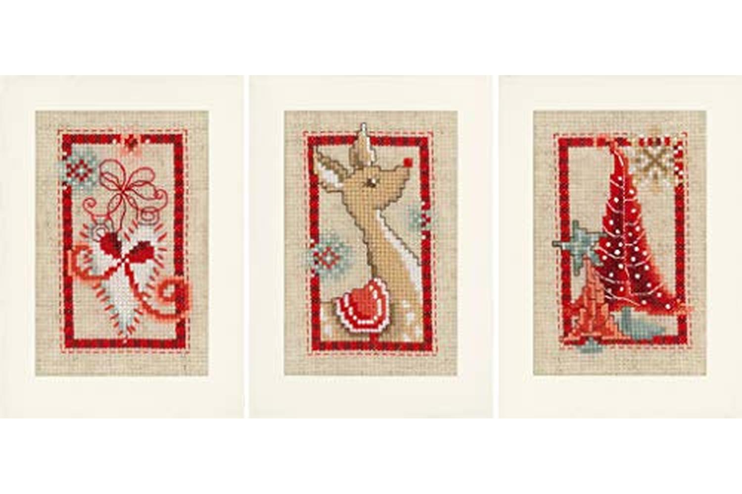 Description: Set of 3 greetings cards with counted cross stitch designs. Kit includes: