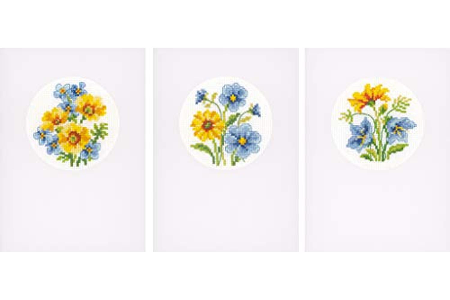 Description: Set of 3 greetings cards with counted cross stitch designs. Kit includes: