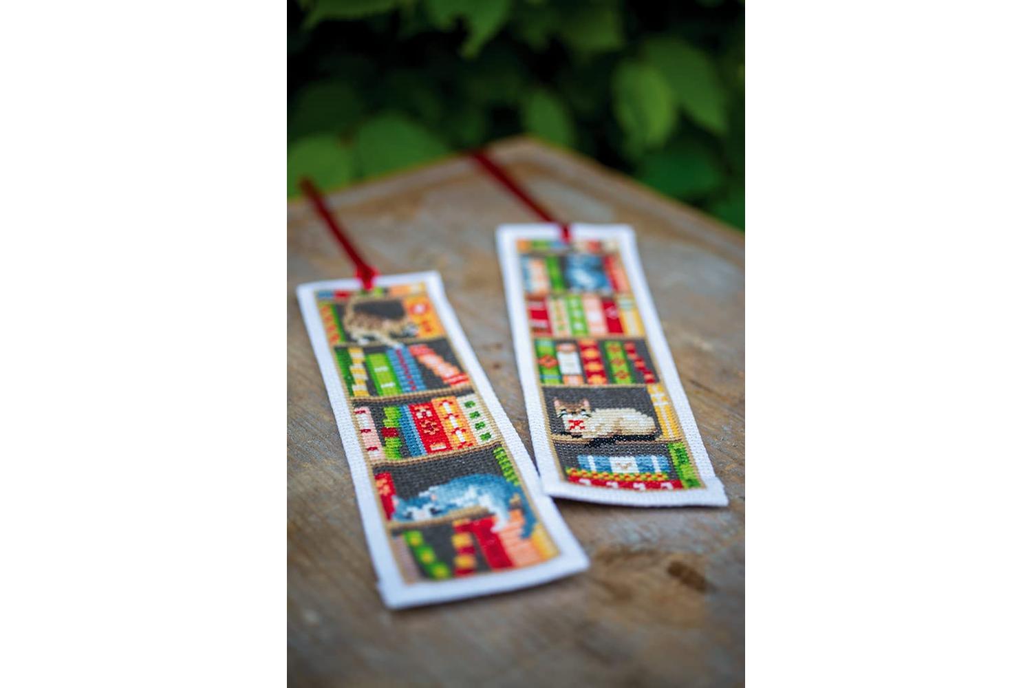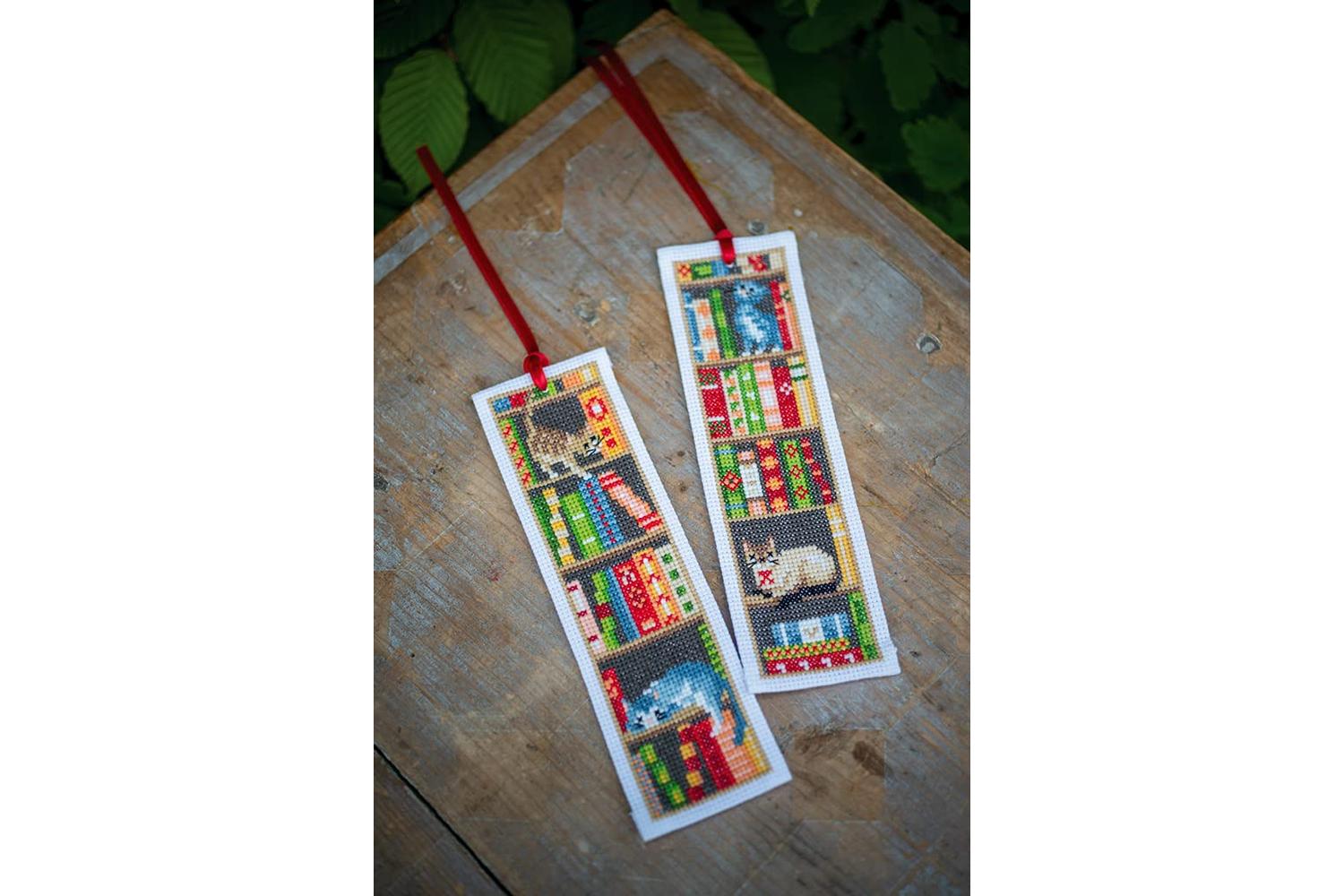 Description: Set of 2 bookmarks with cross stitched designs. Kit includes: 2 pieces of 14 count, white, cotton aida fabric; pre-sorted cotton threads; needle; large-square charted design, front sheet picture, red ribbon and instructions in 8 languages (EN, NL, FR, GER, IT, SP, RU, SW). Approximate finished size: (w/h) 6 x 20cm or 2.4 x 8in. Age category: from 15 years. Stitches used: cross stitch, long stitch. Difficulty level: easy.