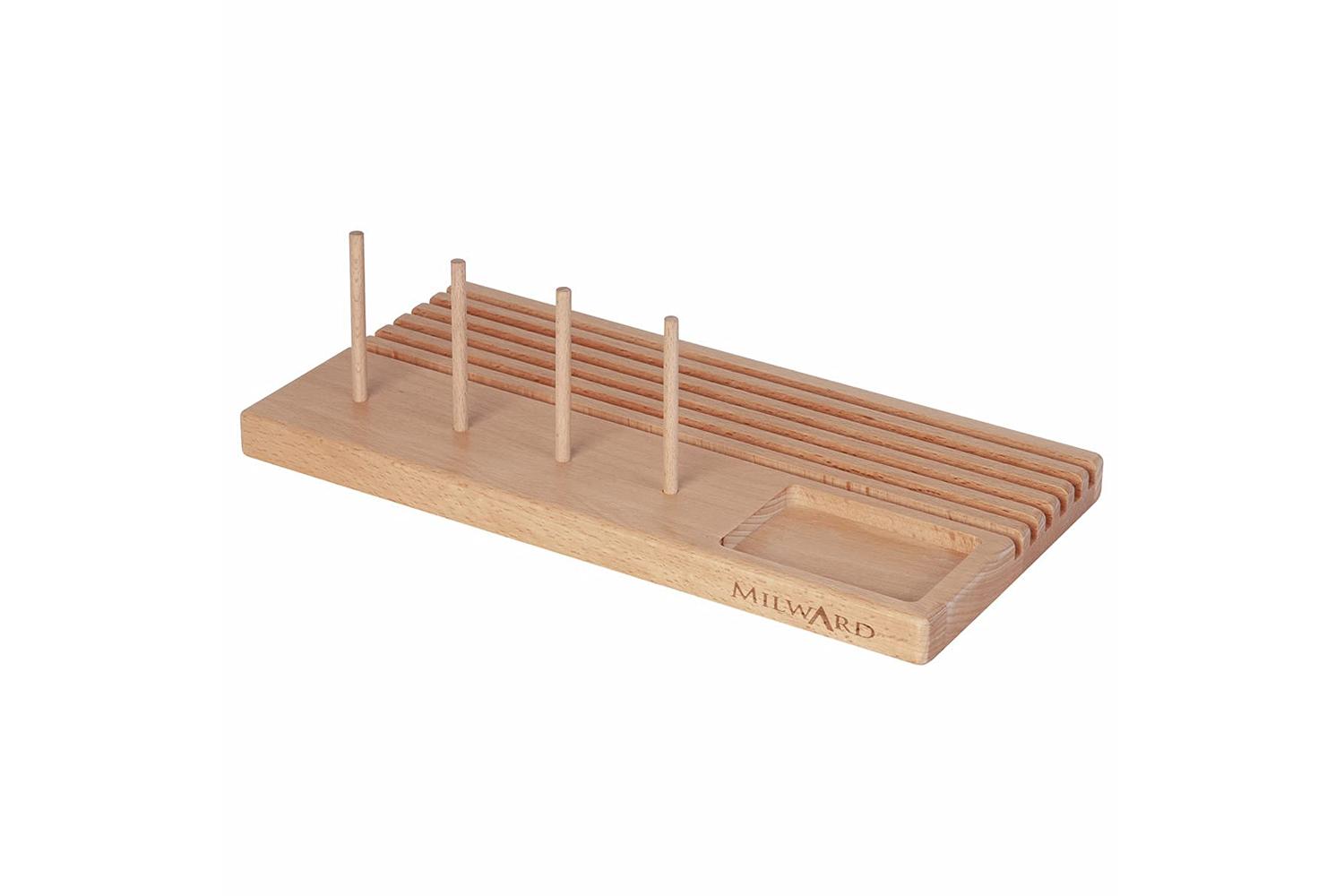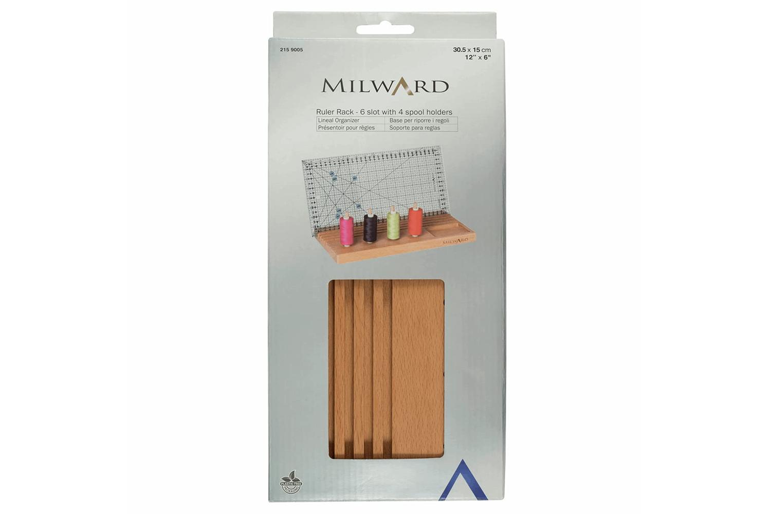 Description: An ideal solution for storing quilting rulers or templates making them accessible and less prone to damage. Front thread spool pegs and a front compartment for storing pins and clips. Pads on the bottom of the rack to stop slipping. Made from durable beech wood with a smooth finish. Laser etched with the Milward Logo.